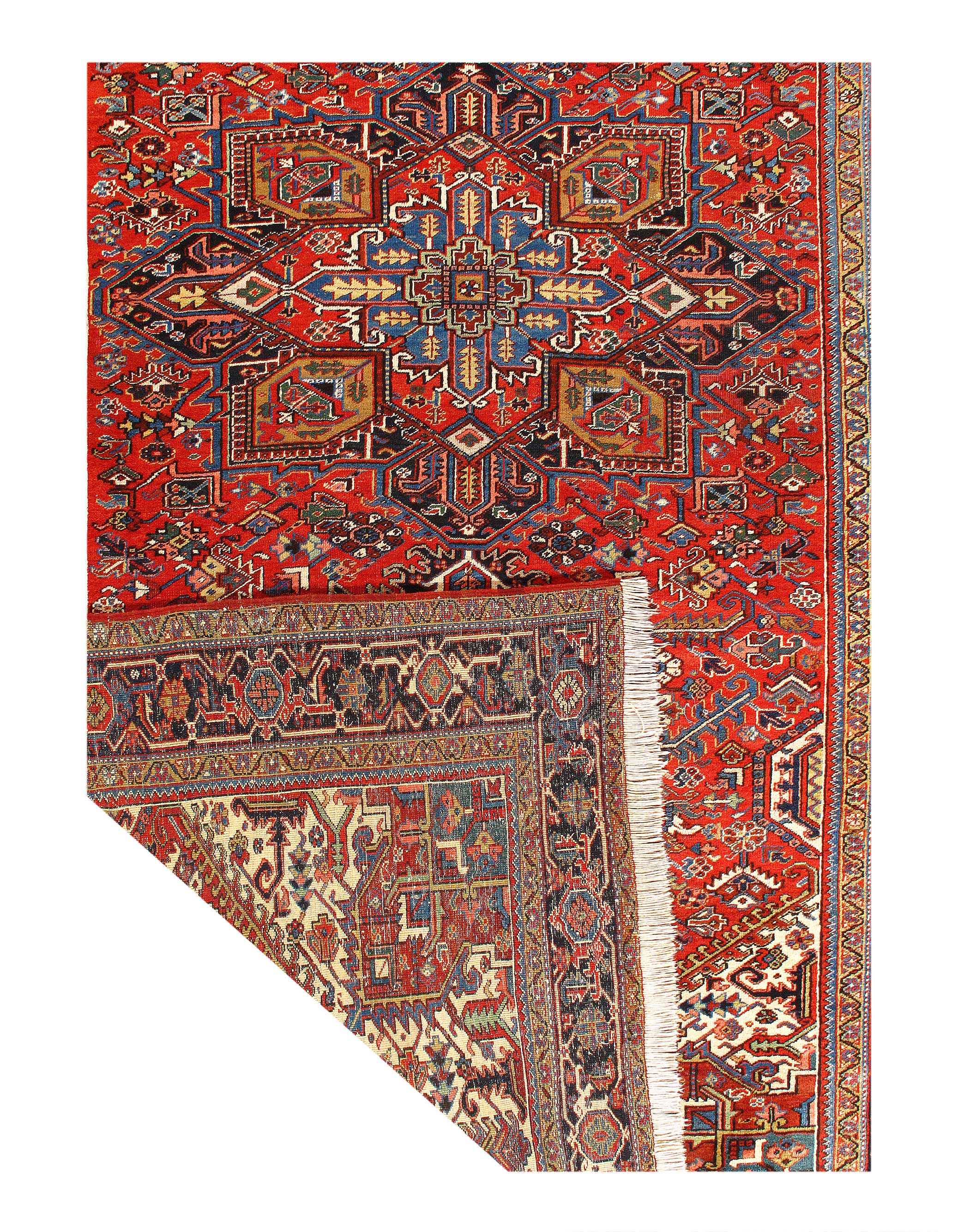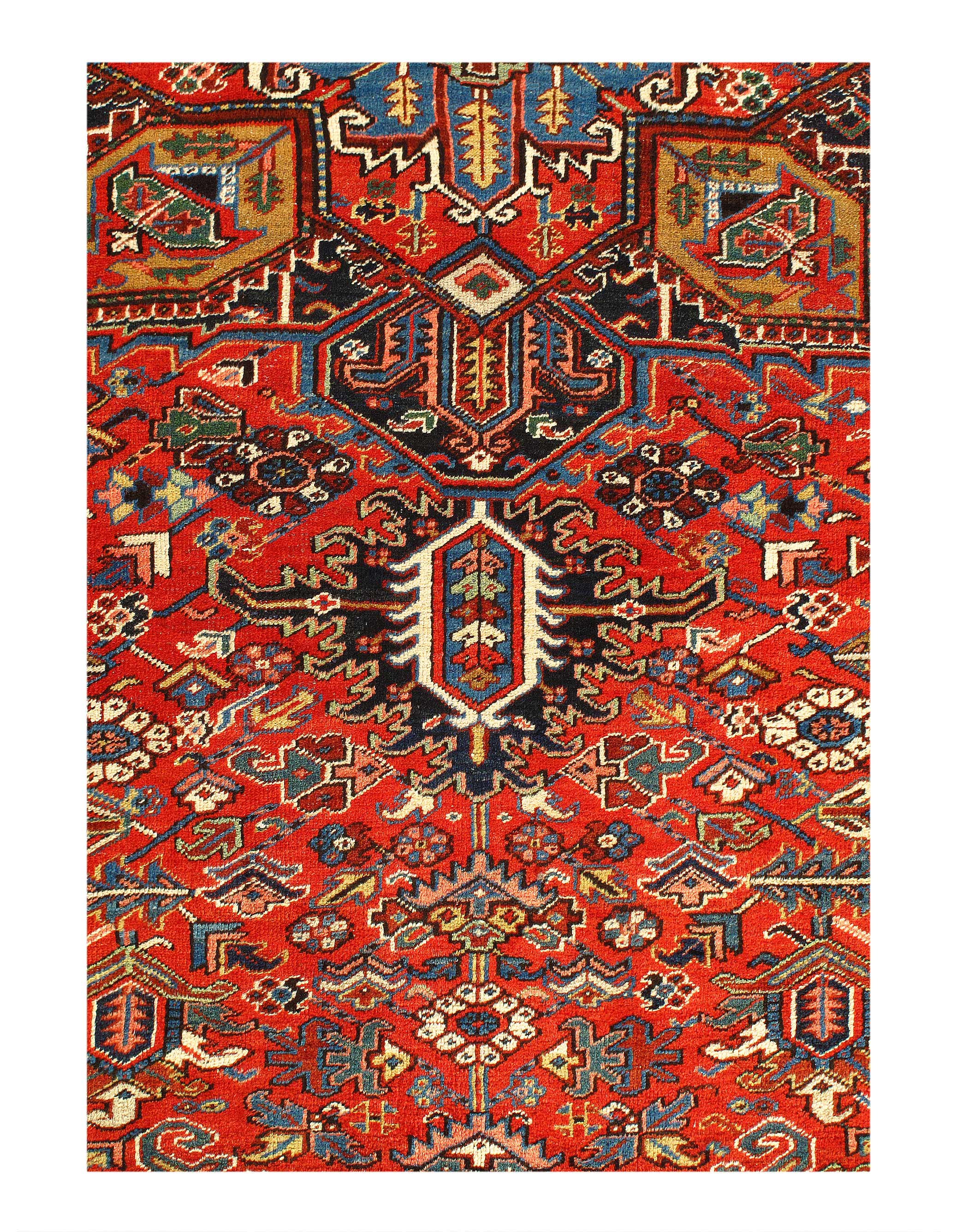 Color plays a pivotal role in defining Heriz rugs, and this rug exemplifies this characteristic flawlessly. The bold red background, symbolizing power, passion, and prosperity in Persian culture, forms the rug’s foundation. Meanwhile, the central medallion and geometric borders intricately incorporate an array of colors, from vivid blues to soft creams and vibrant pops of green. This harmonious interplay of colors not only enhances the rug’s visual appeal but also adds depth and complexity to its overall design.