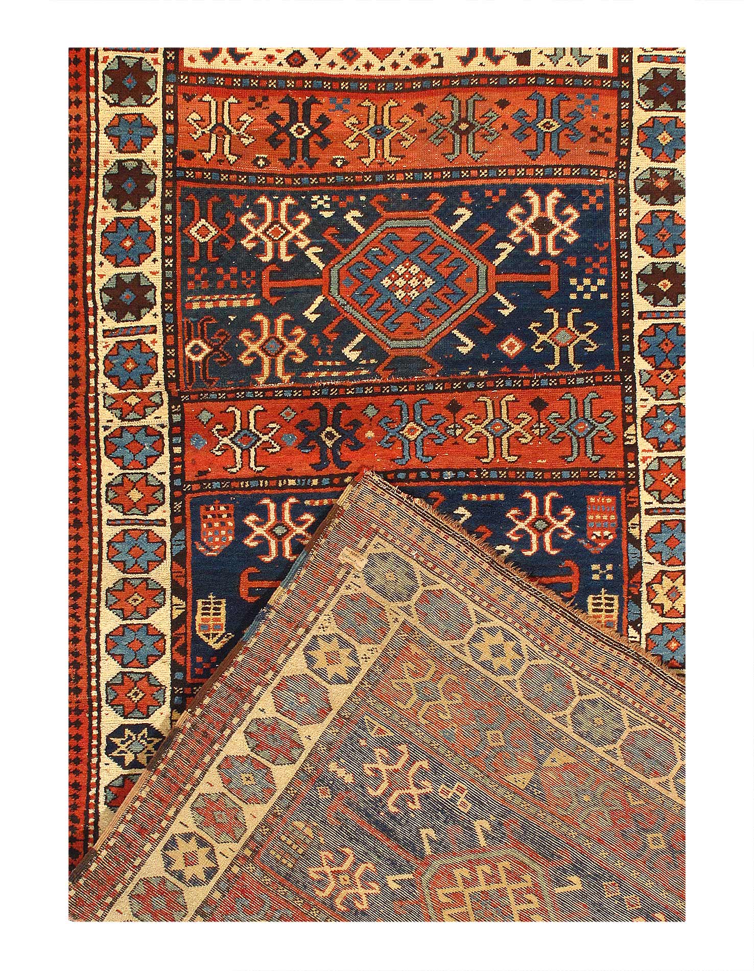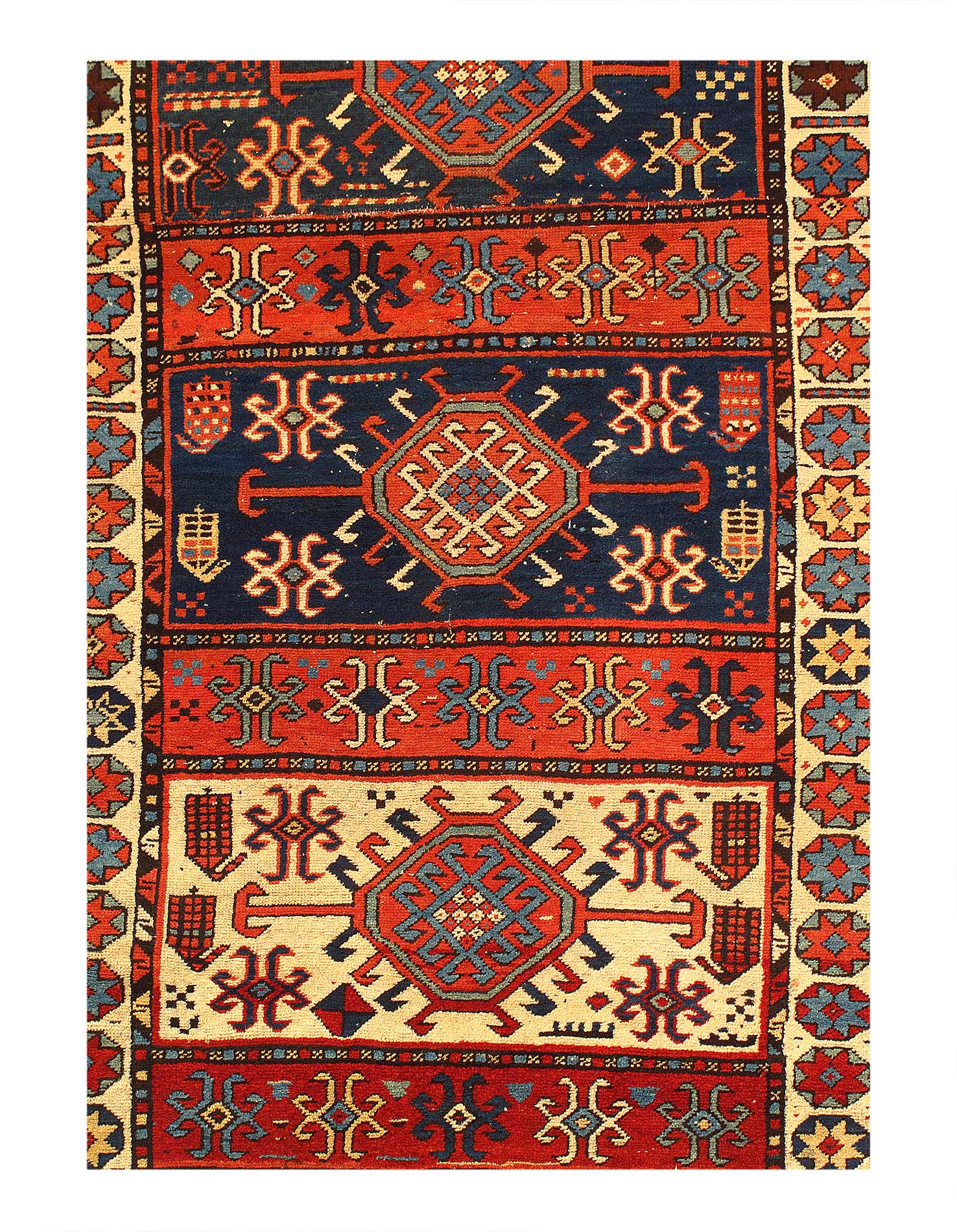 Beautiful Tribal Design Antique Caucasian Runner Rug, Country of Origin / Rug Type: Caucasian Rugs, Circa date: 1900 – This bold, antique Caucasian rug is filled in with bright red, Rust, yellow and Cream. Strong, straight lines with decisive angles describe three prominent ornaments, aligned through the center of the long the antique runner rug. Red octagons emblazoned with hexagonal shields rest at the center of each figure, braced with jagged, leafy vines shaded a rich, hunter green. Red bars separate these forms, vivid against theN Navy blue that fills the background. Straight white and green embellishments add complexity to their designs. Golden decorations reminiscent of questing plant roots rendered stylistically neighbor the bright scarlet shapes, alongside small, simple blossoms and other basic elements. A yellow band edges this space, filled with interlinked, modest flowers depicted in all the bright colors of the antique rug. The widest border adjoins, formed of diagonal strips in alternating colors.