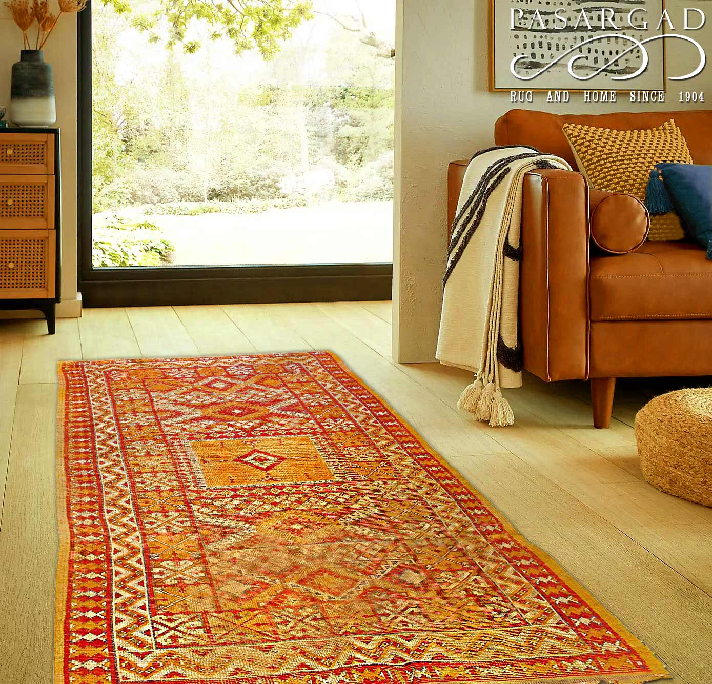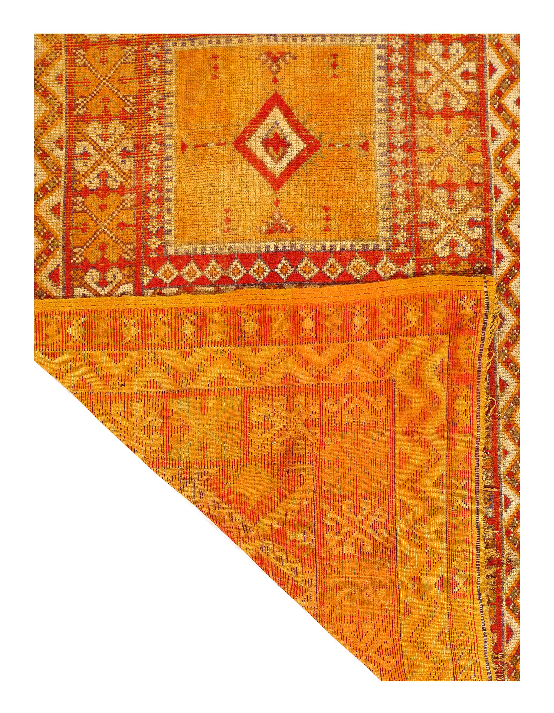 Beautiful Vintage Gold Color Background Moroccan Rug, Country of Origin: Morocco, Circa Date: Mid 20th Century – Stacked lozenges, humanoid figures and ancient protection symbols used to combat the evil eye are prominently featured across the field of this vibrantly colored vintage Moroccan rug, which highlights design elements preferred by the Moroccan weavers of vintage rugs. Created circa 1950, this vintage rug features colorfully striped flat-woven ends and distinctive tribal-influenced motifs rendered in a bold combination of ivory, saffron yellow and red set over a tomato red field. Horizontal bands decorated with checkered goz symbols and staggered Bargello stripes subtly frame the central medallion, which is in turn flanked by a group of checkered bands and towering stacked lozenges. Filled with tribal details and strong colors, this bold Moroccan carpet makes a grand impression with an eclectic visage ideal for rustic and modern spaces alike.