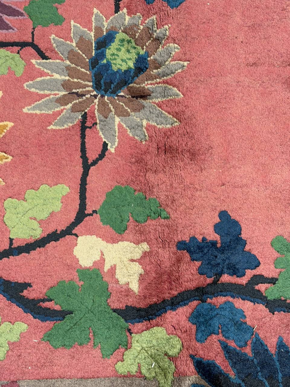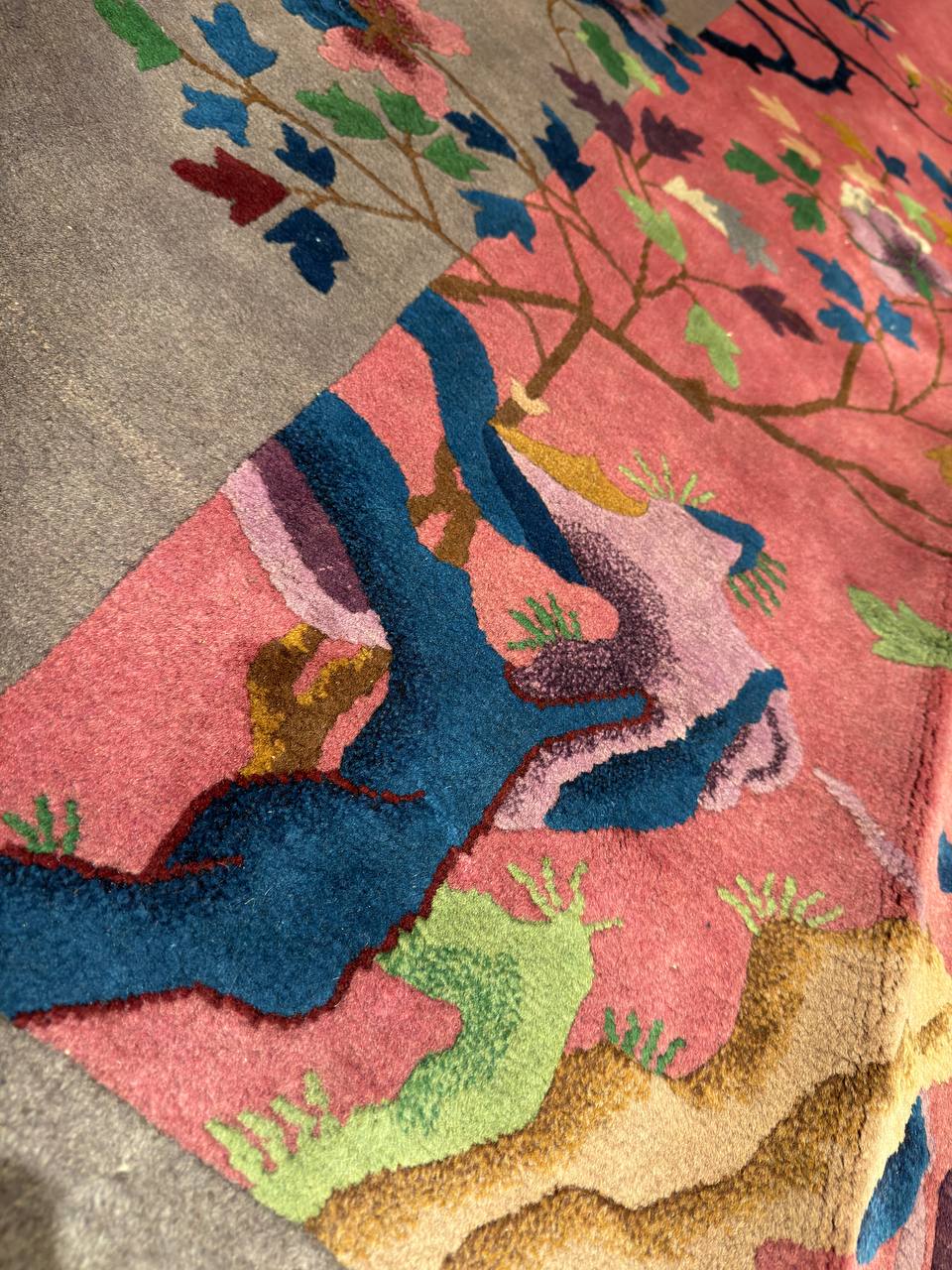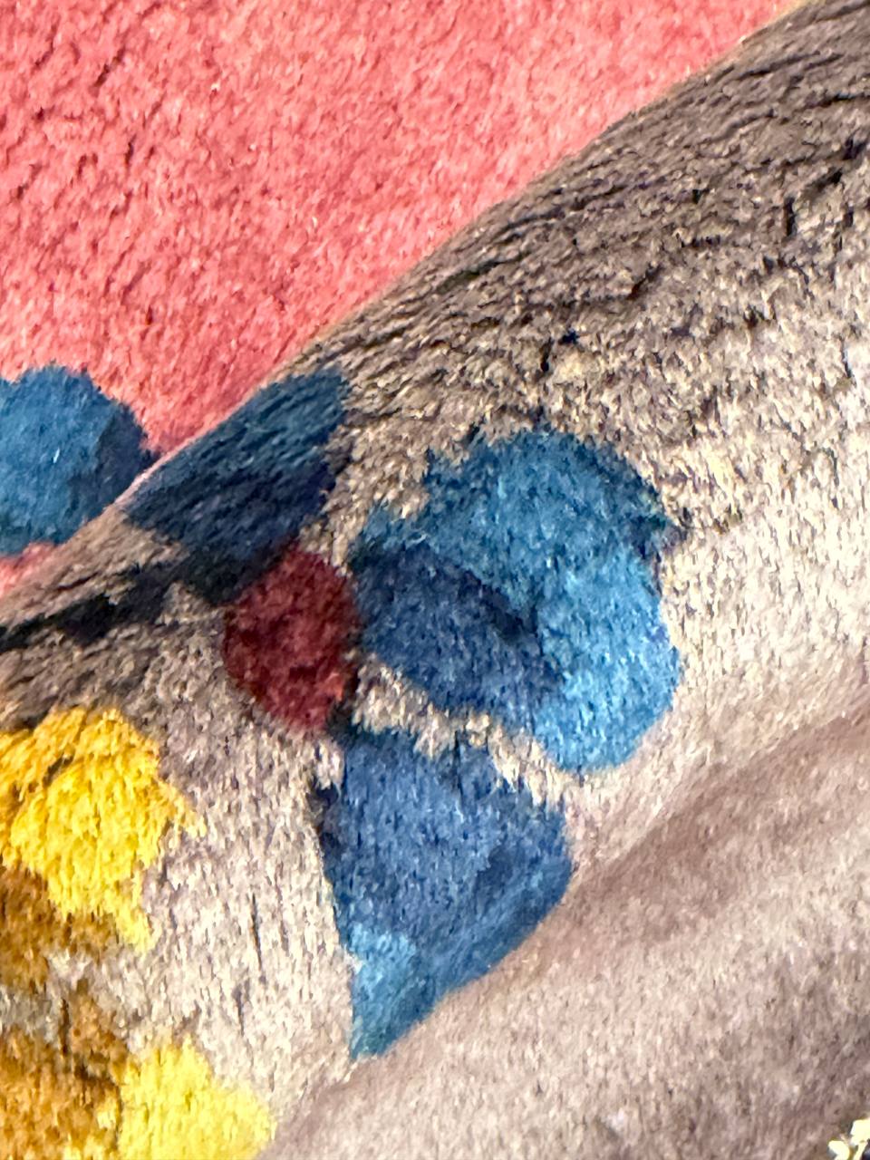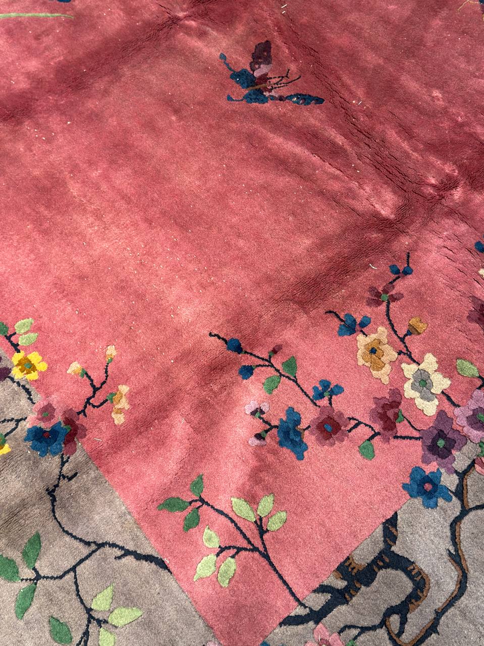 Chinese Deco Rug, Origin: China, Circa: Early 20th Century – Here is an exciting and appealing antique Oriental carpet – an antique Art Deco rug that was designed and woven in China during the early years of the twentieth century. Heavily informed by the aesthetic inclinations of the Art Deco period, this unique carpet is a compelling and thought-provoking example. A scalloped border of Gold encloses a Light Brown / Blue sand field on this exquisitely subtle and restrained antique Chinese Art Deco. At first the field appears empty or open, but it is actually covered by a tone-on-tone design of scrolls and cloud-bands emanating inward from the outer edges. In their sinuous rhythms they echo the scalloped forms of the border and continue its visual effects across the carpet in a more subdued manner. This carpet testifies to the masterful design sensibilities of Chinese weavers as they made the transition into the modern world. The Art Deco movement had an outside influence on the world of art and design, and some of the most important qualities and characteristics of that movement may be found in this fine rug.