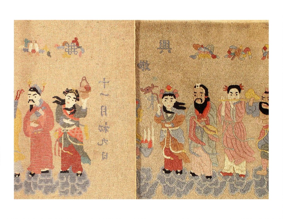 This is a Chinese rug featuring the Immortals (Ba Xian), who are legendary figures in Taoist mythology.