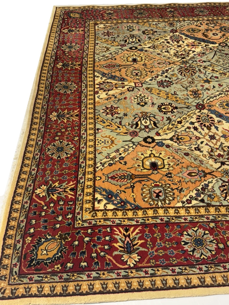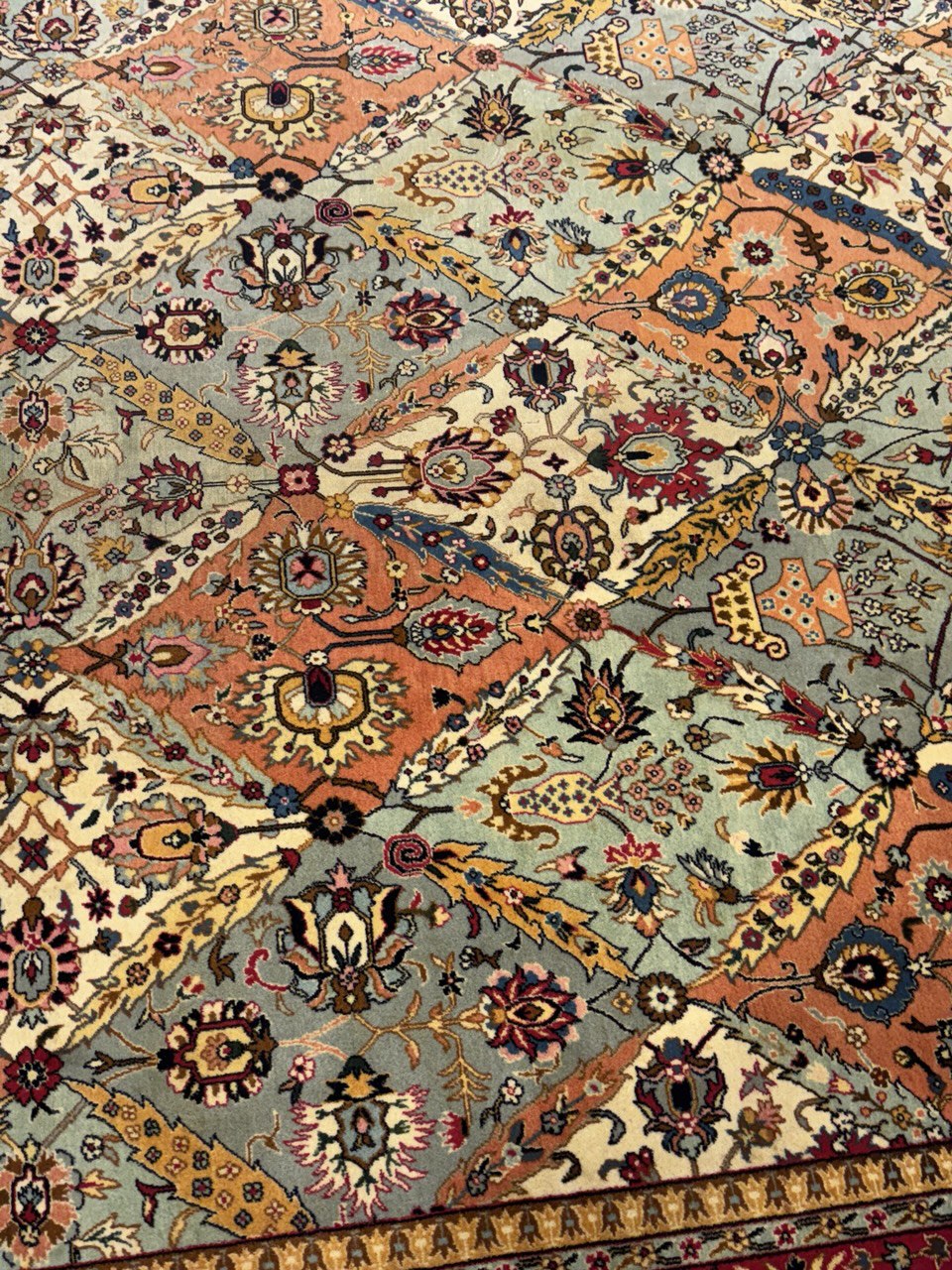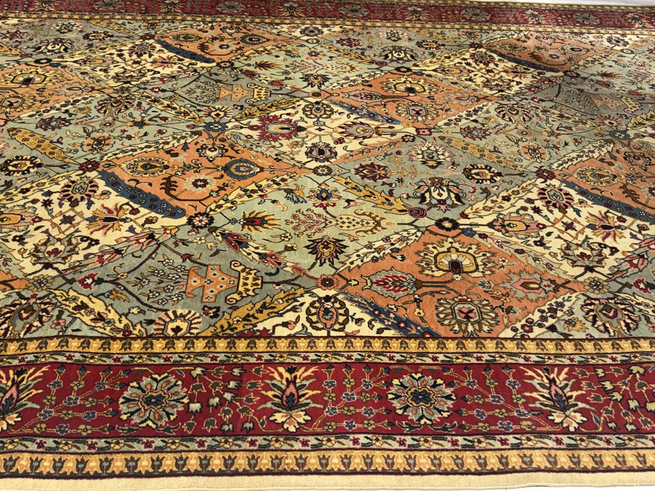 Magnificent Garden Design Room Size Antique Persian Tabriz Rug, Country of Origin / Rug Type: Persian Rug, Circa Date: 1920 – This beautiful antique rug is an excellent example of why Tabriz remained a Persian rug making center that was known for its exquisite artistry for many hundreds of years. This antique Persian Tabriz rug dates back to around the 1920’s and features a beautiful rendition of the iconic garden design. The colorful designs of the antique Persian rug present the viewer with glimpses into little garden scenes, as if they were peering at them through a window.