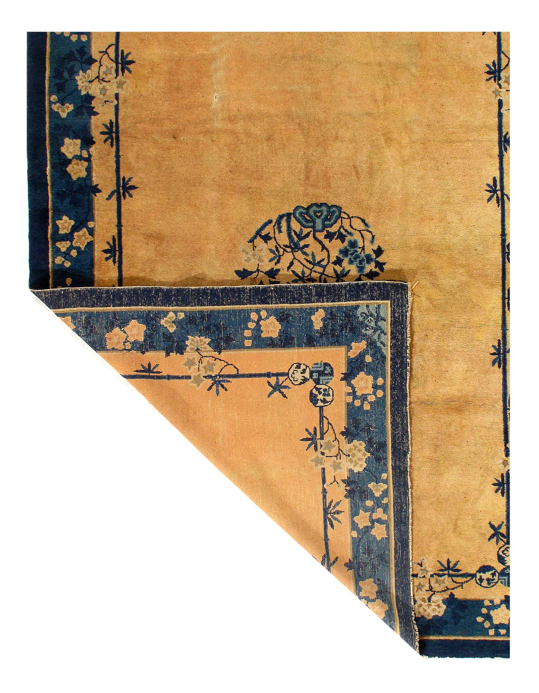 Antique Chinese Deco Rug, Origin: China, Circa: Early 20th Century – Here is an exciting and appealing antique Oriental carpet – an antique Art Deco rug that was designed and woven in China during the early years of the twentieth century. Heavily informed by the aesthetic inclinations of the Art Deco period, this unique carpet is a compelling and thought-provoking example. A scalloped Beige encloses a Navy Blue sand field on this exquisitely subtle and restrained antique Chinese Art Deco. At first the field appears empty or open, but it is actually covered by a tone-on-tone design of scrolls and cloud-bands emanating inward from the outer edges. In their sinuous rhythms they echo the scalloped forms of the border and continue its visual effects across the carpet in a more subdued manner. This carpet testifies to the masterful design sensibilities of Chinese weavers as they made the transition into the modern world. The Art Deco movement had an outside influence on the world of art and design, and some of the most important qualities and characteristics of that movement may be found in this fine small rug.