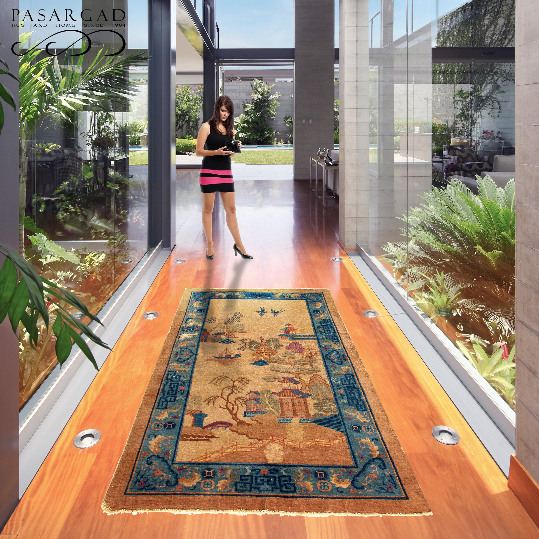 Chinese Deco Rug, Origin: China, Circa: Early 20th Century – Here is an exciting and appealing antique Oriental carpet – an antique Art Deco rug that was designed and woven in China during the early years of the twentieth century. Heavily informed by the aesthetic inclinations of the Art Deco period, this unique carpet is a compelling and thought-provoking example. A scalloped border of Beige / Ivory / light blue sand field on this exquisitely subtle and restrained antique Chinese Art Deco. At first the field appears empty or open, but it is actually covered by a tone-on-tone design of scrolls and cloud-bands emanating inward from the outer edges. In their sinuous rhythms they echo the scalloped forms of the border and continue its visual effects across the carpet in a more subdued manner. This carpet testifies to the masterful design sensibilities of Chinese weavers as they made the transition into the modern world. The Art Deco movement had an outside influence on the world of art and design, and some of the most important qualities and characteristics of that movement may be found in this fine rug.