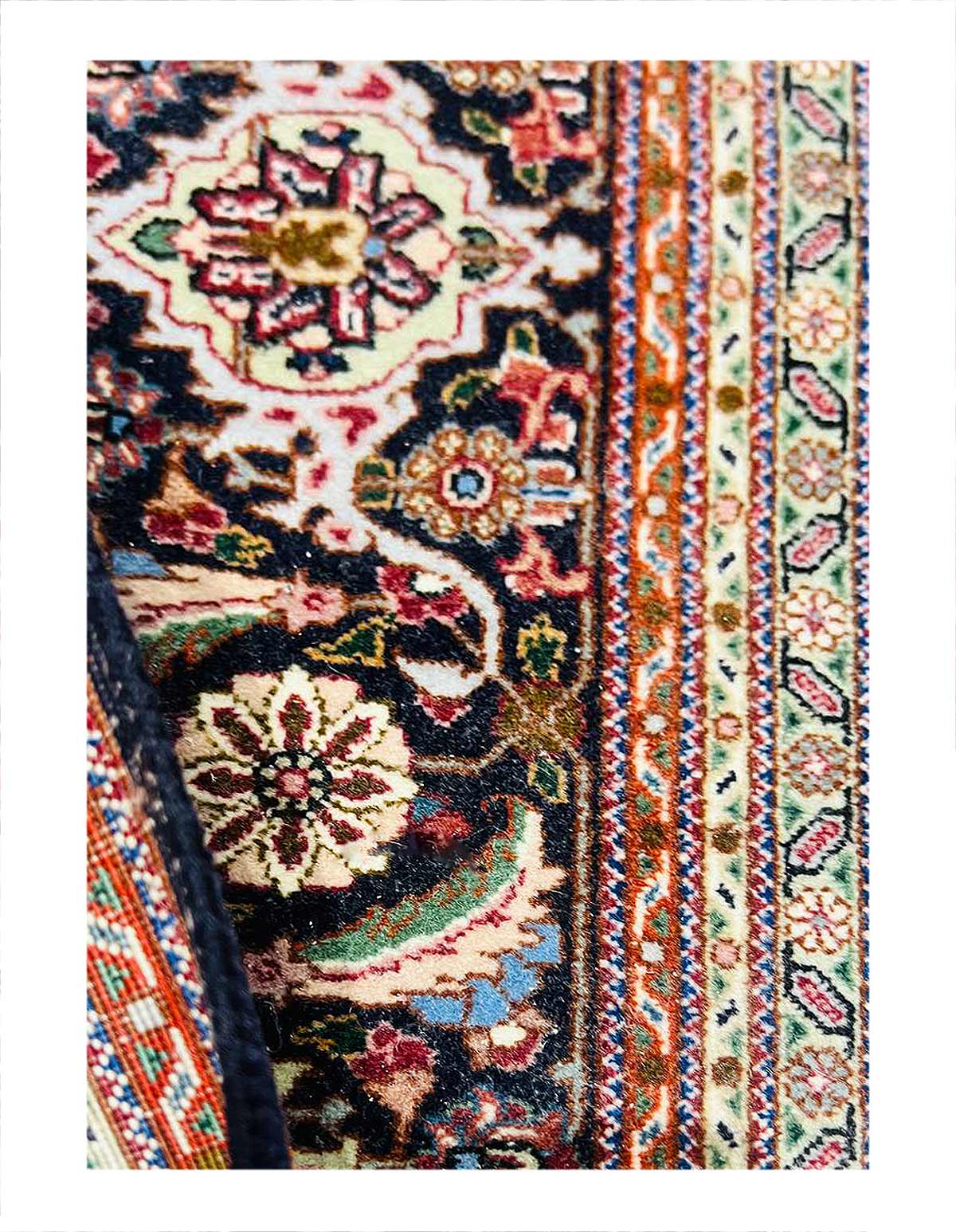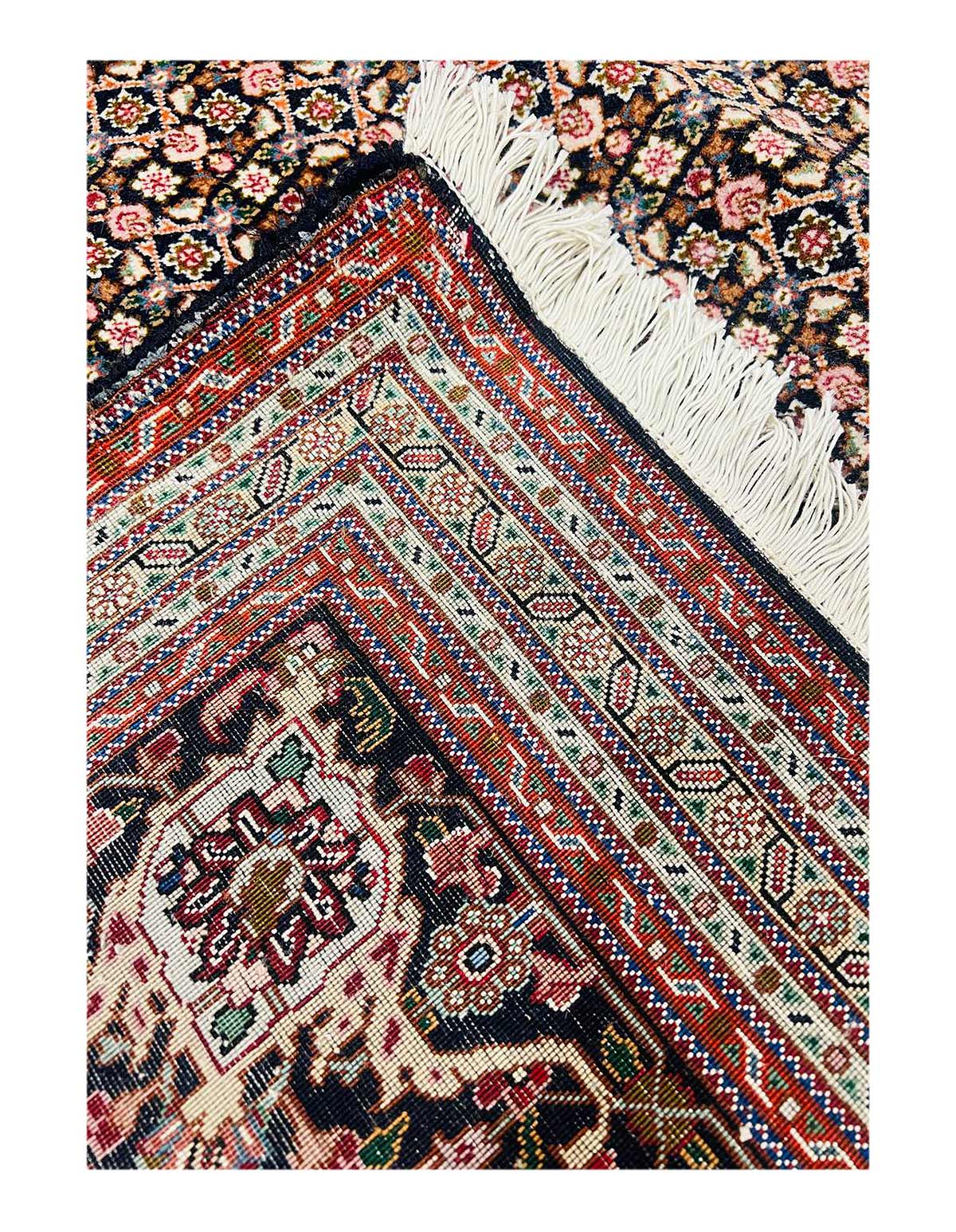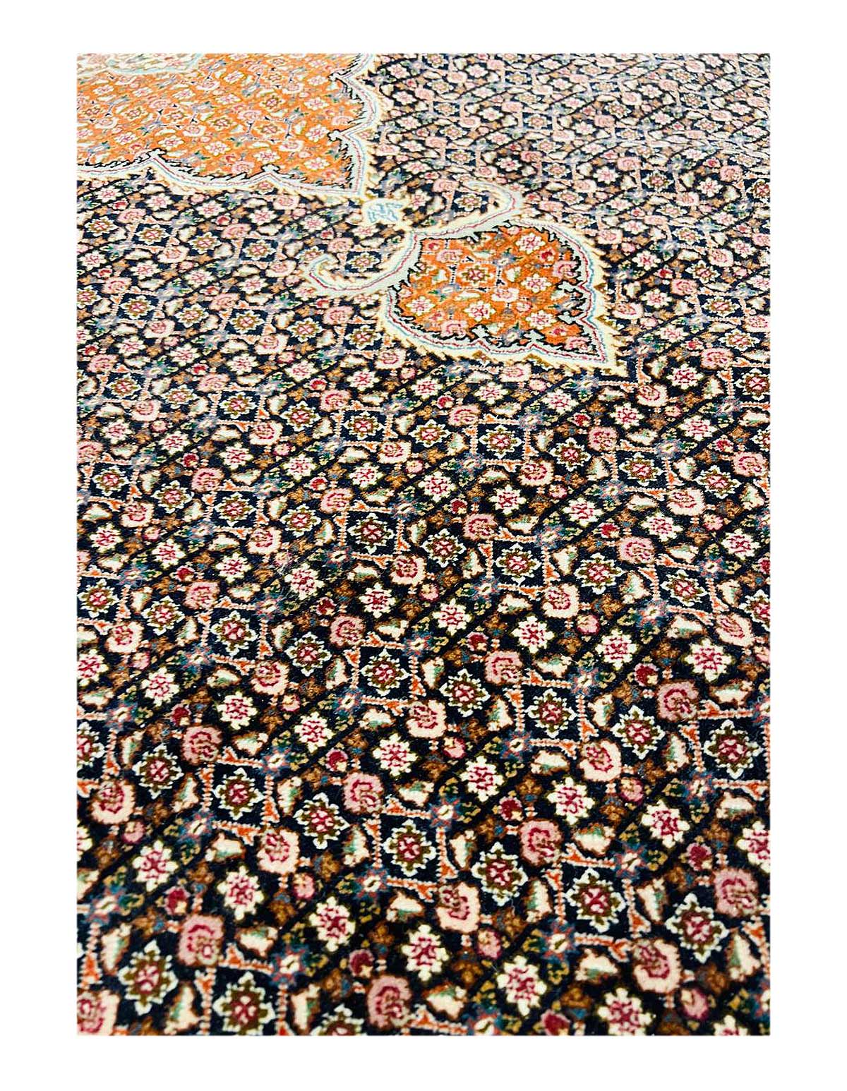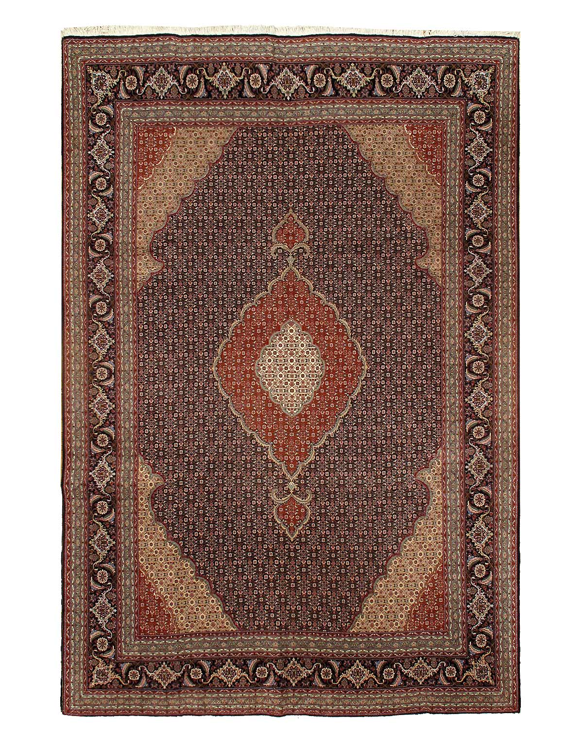 Amongst the most classic and popular pattern in Tabriz rugs is the Mahi design, which is also known as the Fish design. The Tabriz Mahi rugs are very common and are typically found in most Persian rug stores. In fact, this design is so popular that it is also very common to find it in imitation rugs from China and India. Most Mahi pieces are standard sized Tabriz rugs with a large center medallion and the main colors are typically Black, , and 4 shades of Red ,Brown,Black,Beige....
