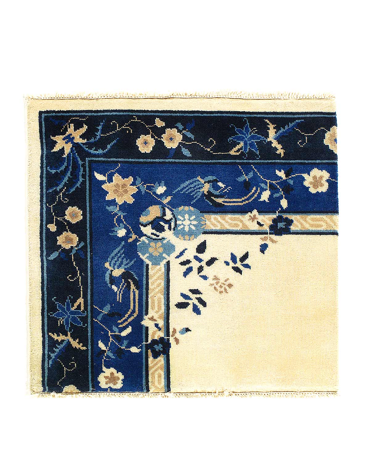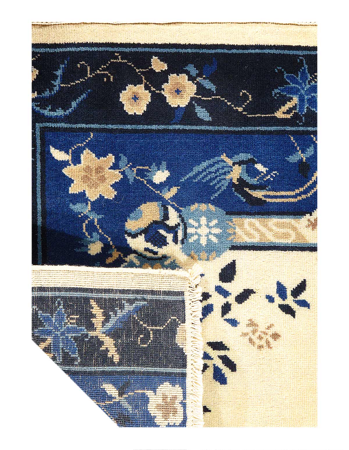 A beautiful antique Art Peking Design Sample Chinese hand-knotted wool rug with a Ivory field. This rug has a blue frame, , red, ivory accents in a gorgeous Chinese floral design. New from India.