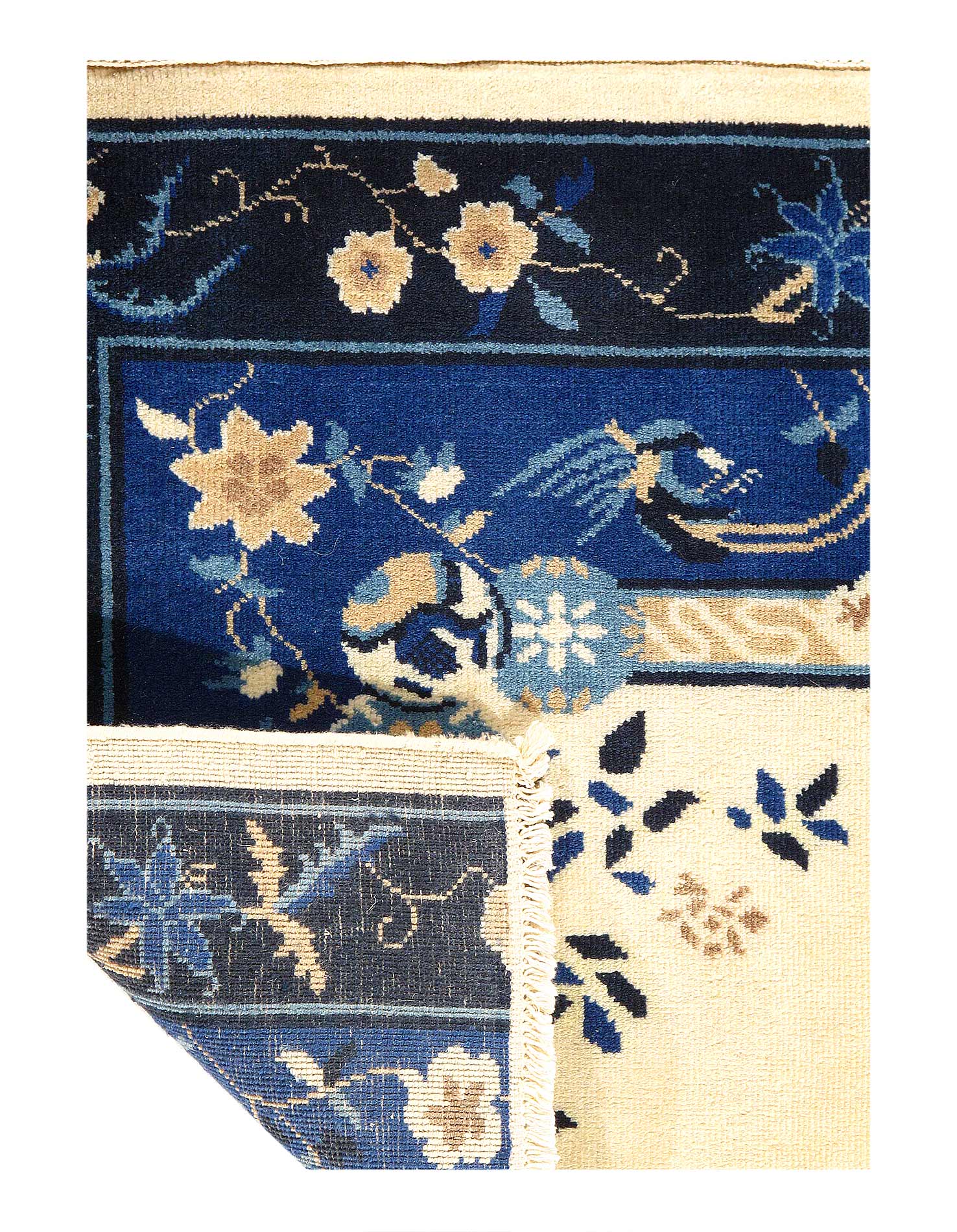 A beautiful antique Art Peking Design Sample Chinese hand-knotted wool rug with a Ivory field. This rug has a blue frame, , red, ivory accents in a gorgeous Chinese floral design. New from India.