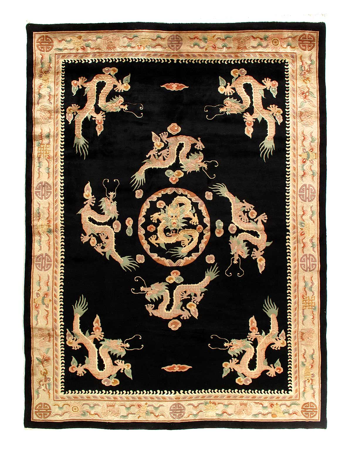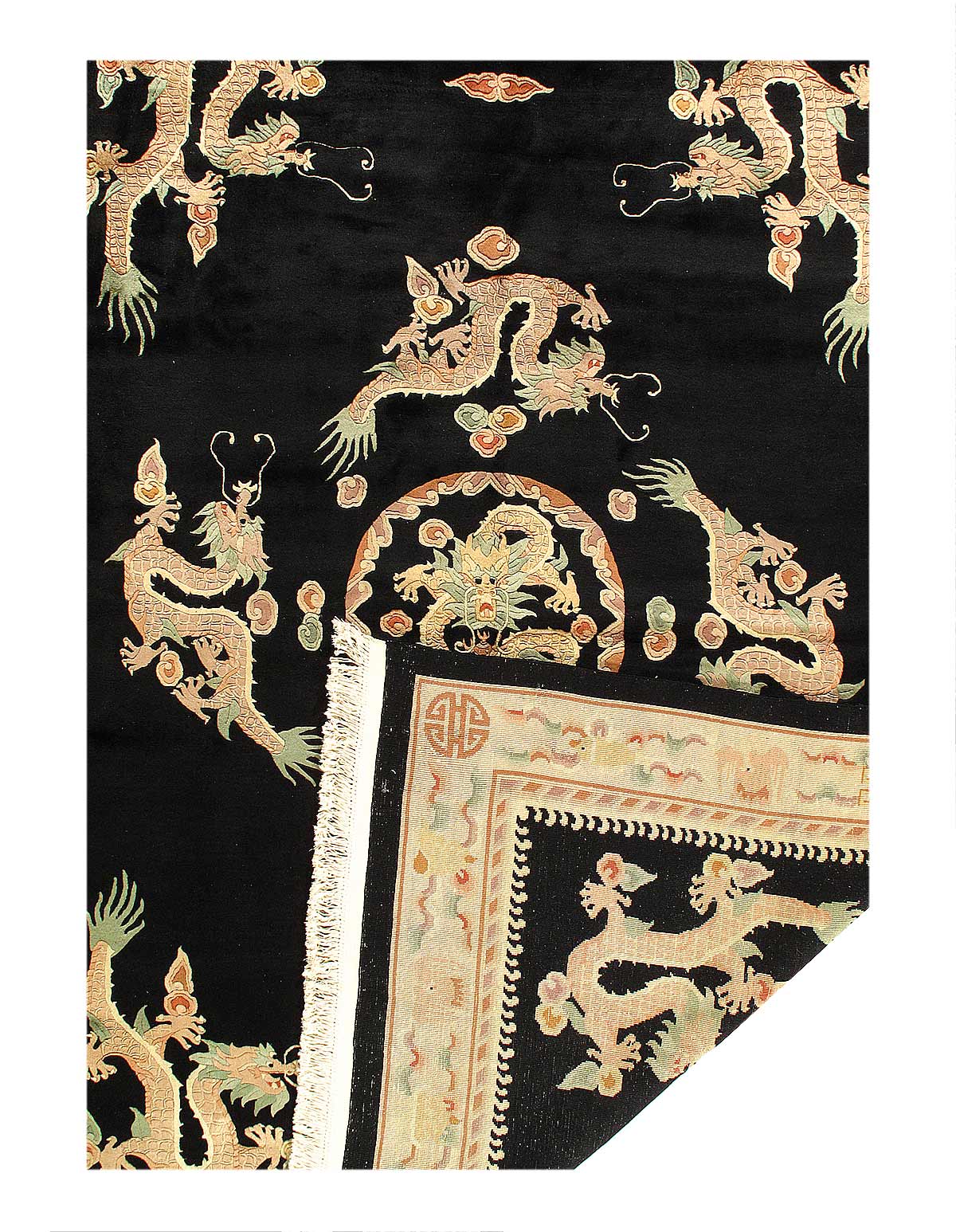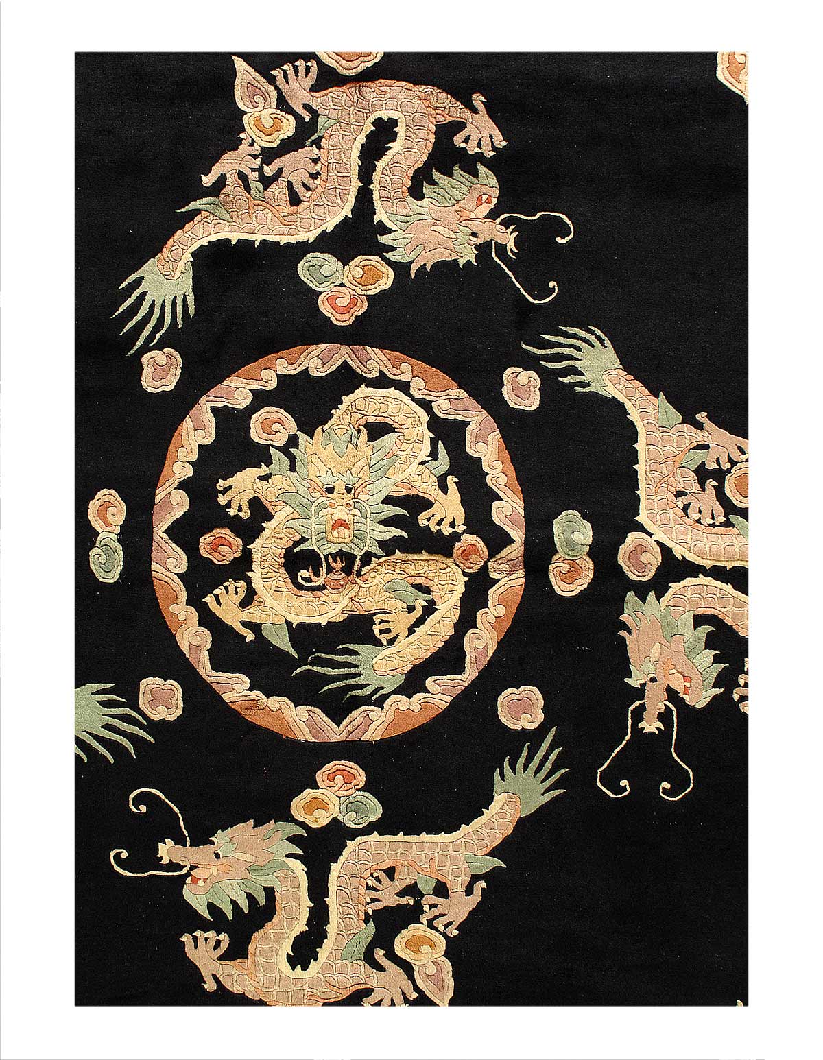 Gorgeous And Extremely Artistic Antique Chinese Two Claw Dragon Design Shabby Elegance Rug, Circa Date: 1960 - A beautiful array of Two clawed Chinese dragons are gracefully flying across the expanse of this breathtaking antique Chinese rug. This is a fascinating and highly artistic antique rug was woven in China around the 1960’s.