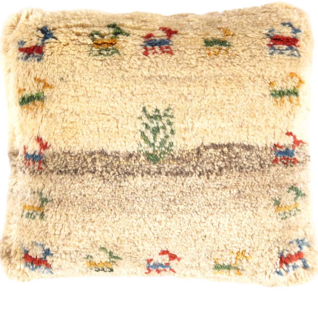 The word “Gabbeh” literally translates to “in the rough,” and it is an accurate description of this style of Persian rug. Gabbeh carpets are woven on makeshift ground looms constructed both of materials that are kept and hauled for long distances by the nomadic tribel, and also of materials that are found at each site where the tribe sets up camp. Due to the fact that part of the loom must be found at each site, a wide variety is introduced. Thus, these rugs are usually somewhat irregular in shape. But, for what they lack in perfectly uniform shape they more than make up for in character, durability and uniqueness.This Gabbeh pillow is made of high-quality LAMBS WOOL The piece was crafted with good workmanship.