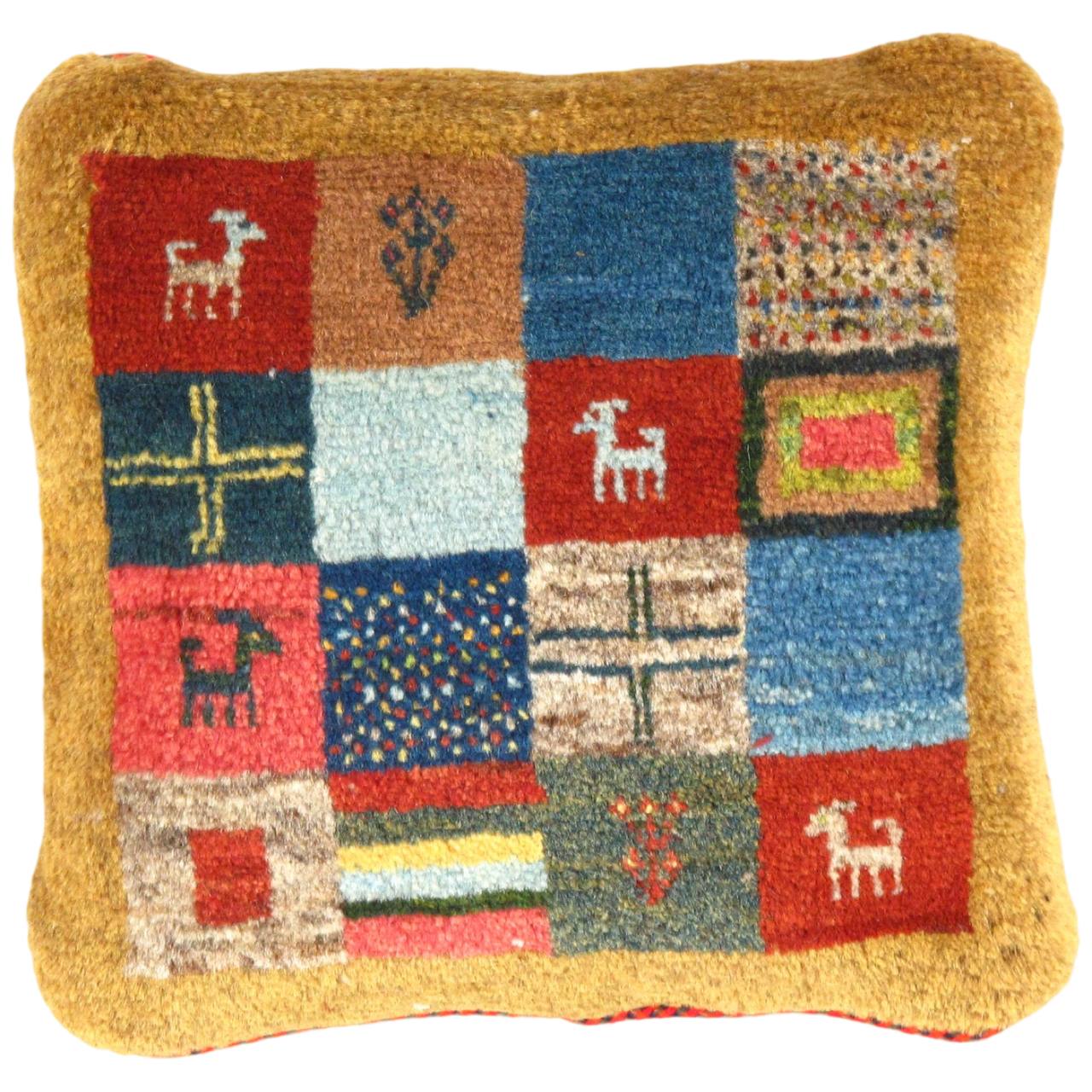 The word “Gabbeh” literally translates to “in the rough,” and it is an accurate description of this style of Persian rug. Gabbeh carpets are woven on makeshift ground looms constructed both of materials that are kept and hauled for long distances by the nomadic tribel, and also of materials that are found at each site where the tribe sets up camp. Due to the fact that part of the loom must be found at each site, a wide variety is introduced. Thus, these rugs are usually somewhat irregular in shape. But, for what they lack in perfectly uniform shape they more than make up for in character, durability and uniqueness.This Gabbeh pillow is made of high-quality LAMBS WOOL The piece was crafted with good workmanship