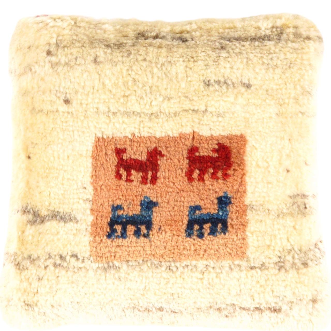 The word “Gabbeh” literally translates to “in the rough,” and it is an accurate description of this style of Persian rug. Gabbeh carpets are woven on makeshift ground looms constructed both of materials that are kept and hauled for long distances by the nomadic tribel, and also of materials that are found at each site where the tribe sets up camp. Due to the fact that part of the loom must be found at each site, a wide variety is introduced. Thus, these rugs are usually somewhat irregular in shape. But, for what they lack in perfectly uniform shape they more than make up for in character, durability and uniqueness.This Gabbeh pillow is made of high-quality LAMBS WOOL The piece was crafted with good workmanship.