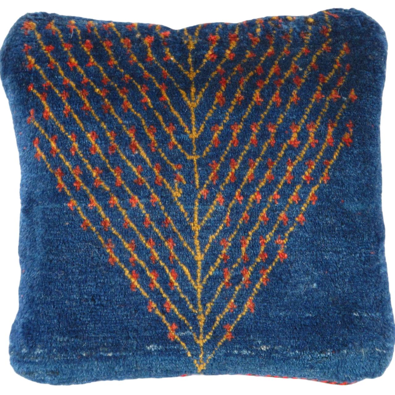 The word “Gabbeh” literally translates to “in the rough,” and it is an accurate description of this style of Persian rug. Gabbeh carpets are woven on makeshift ground looms constructed both of materials that are kept and hauled for long distances by the nomadic tribel, and also of materials that are found at each site where the tribe sets up camp. Due to the fact that part of the loom must be found at each site, a wide variety is introduced. Thus, these rugs are usually somewhat irregular in shape. But, for what they lack in perfectly uniform shape they more than make up for in character, durability and uniqueness.This Gabbeh pillow is made of high-quality LAMBS WOOL The piece was crafted with good workmanship.