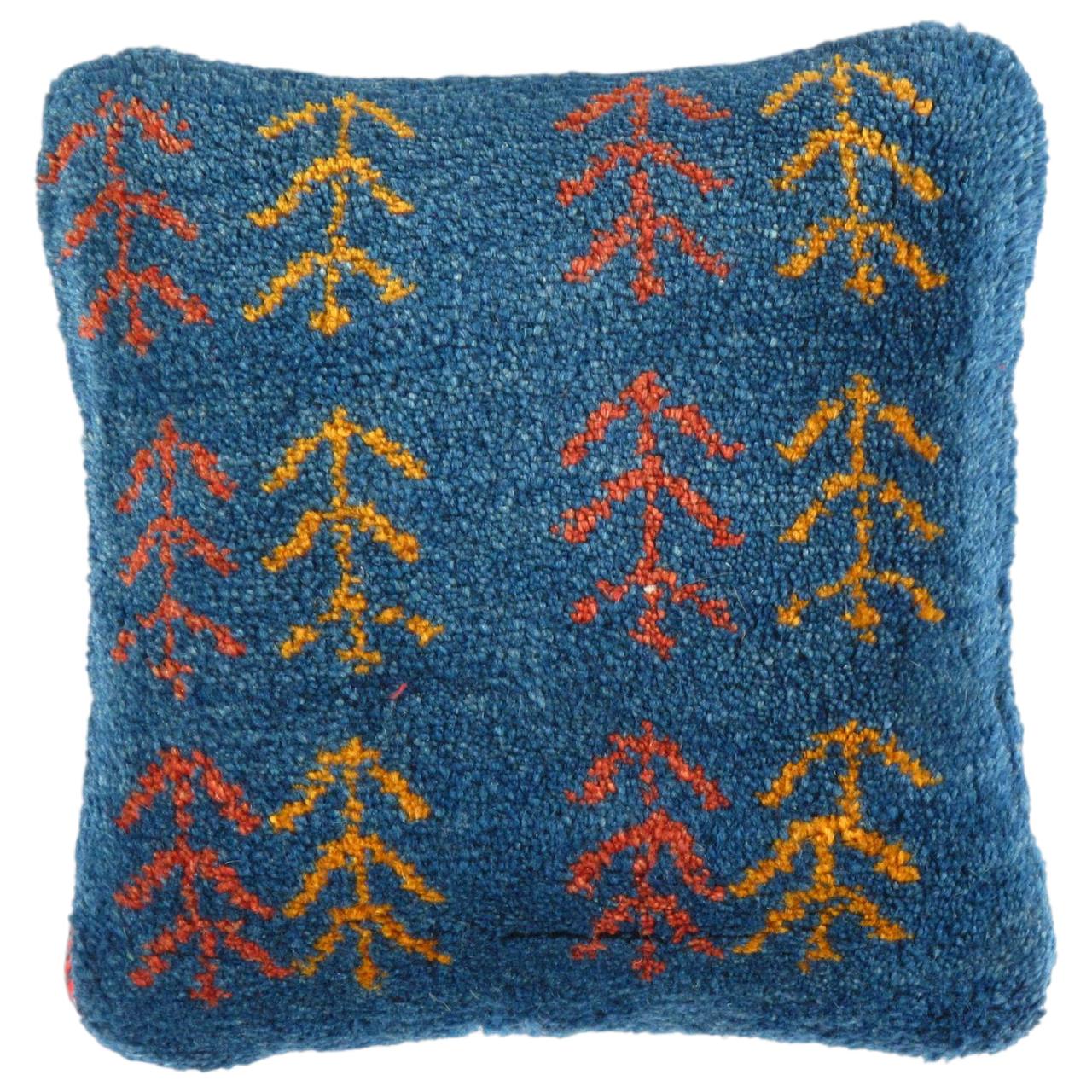 The word “Gabbeh” literally translates to “in the rough,” and it is an accurate description of this style of Persian rug. Gabbeh carpets are woven on makeshift ground looms constructed both of materials that are kept and hauled for long distances by the nomadic tribel, and also of materials that are found at each site where the tribe sets up camp. Due to the fact that part of the loom must be found at each site, a wide variety is introduced. Thus, these rugs are usually somewhat irregular in shape. But, for what they lack in perfectly uniform shape they more than make up for in character, durability and uniqueness.This Gabbeh pillow is made of high-quality LAMBS WOOL The piece was crafted with good workmanship
