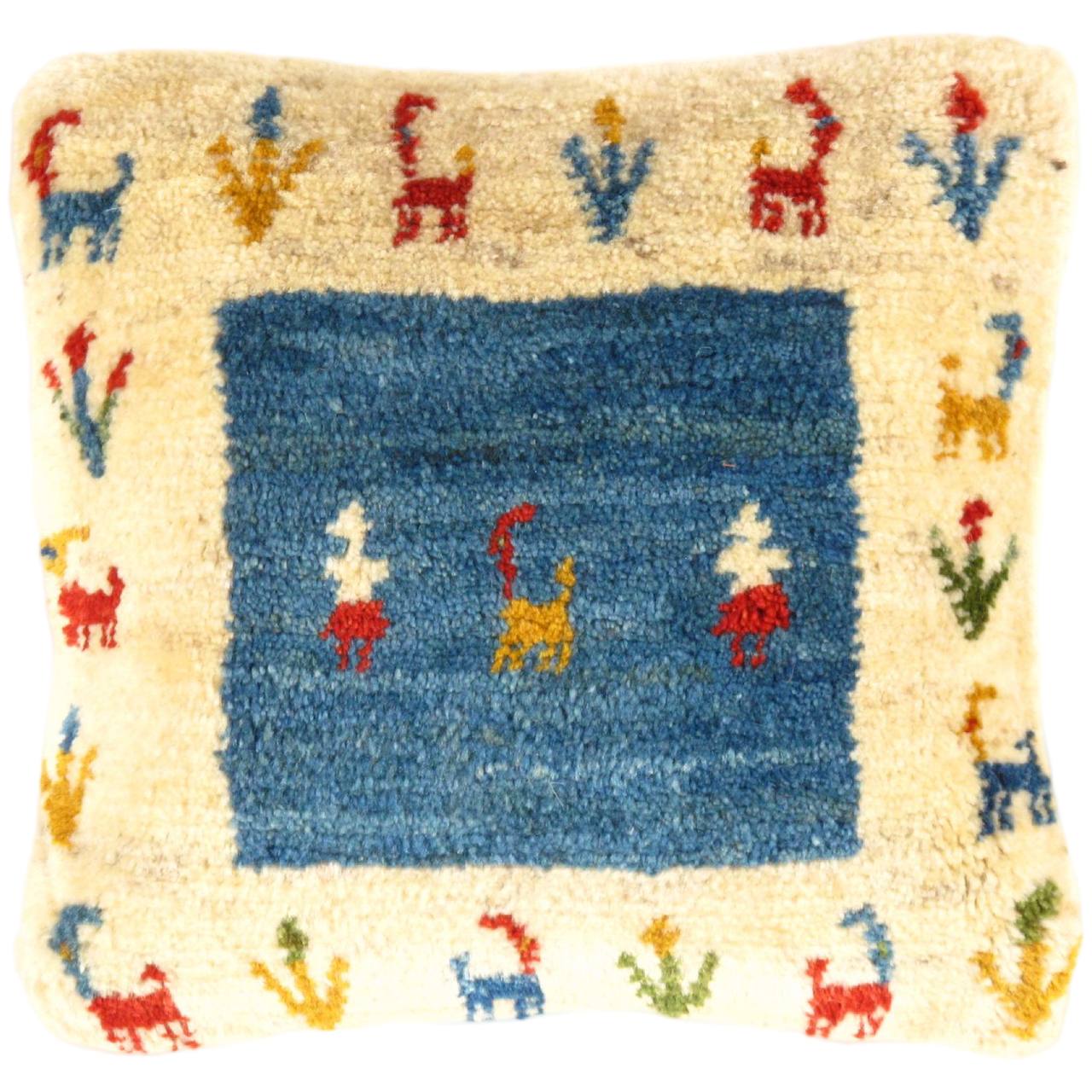 The word “Gabbeh” literally translates to “in the rough,” and it is an accurate description of this style of Persian rug. Gabbeh carpets are woven on makeshift ground looms constructed both of materials that are kept and hauled for long distances by the nomadic tribel, and also of materials that are found at each site where the tribe sets up camp. Due to the fact that part of the loom must be found at each site, a wide variety is introduced. Thus, these rugs are usually somewhat irregular in shape. But, for what they lack in perfectly uniform shape they more than make up for in character, durability and uniqueness.This Gabbeh pillow is made of high-quality LAMBS WOOL The piece was crafted with good workmanship.
