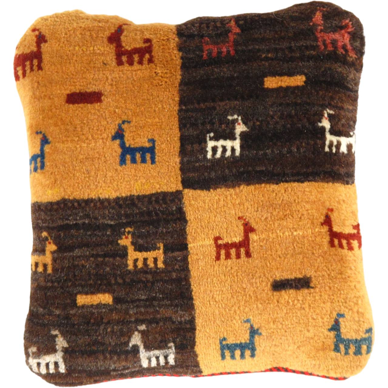 The word “Gabbeh” literally translates to “in the rough,” and it is an accurate description of this style of Persian rug. Gabbeh carpets are woven on makeshift ground looms constructed both of materials that are kept and hauled for long distances by the nomadic tribel, and also of materials that are found at each site where the tribe sets up camp. Due to the fact that part of the loom must be found at each site, a wide variety is introduced. Thus, these rugs are usually somewhat irregular in shape. But, for what they lack in perfectly uniform shape they more than make up for in character, durability and uniqueness.This Gabbeh pillow is made of high-quality LAMBS WOOL The piece was crafted with good workmanship.