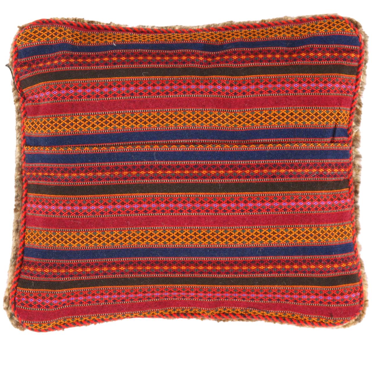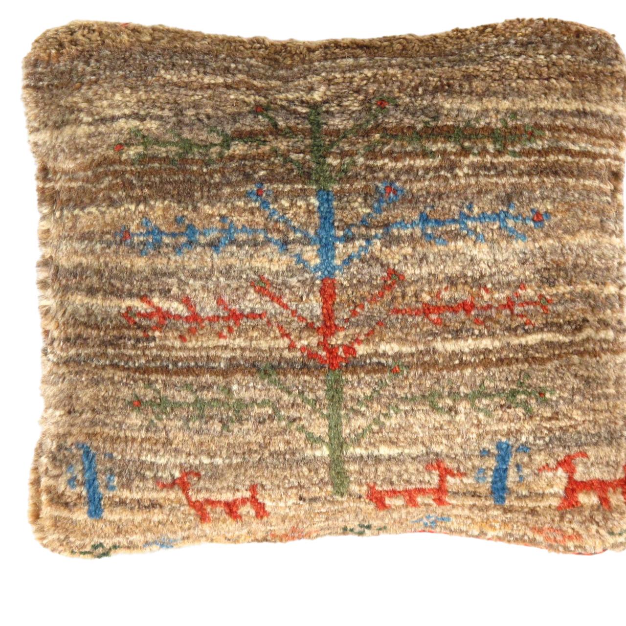 The word “Gabbeh” literally translates to “in the rough,” and it is an accurate description of this style of Persian rug. Gabbeh carpets are woven on makeshift ground looms constructed both of materials that are kept and hauled for long distances by the nomadic tribel, and also of materials that are found at each site where the tribe sets up camp. Due to the fact that part of the loom must be found at each site, a wide variety is introduced. Thus, these rugs are usually somewhat irregular in shape. But, for what they lack in perfectly uniform shape they more than make up for in character, durability and uniqueness.This Gabbeh pillow is made of high-quality LAMBS WOOL The piece was crafted with good workmanship.