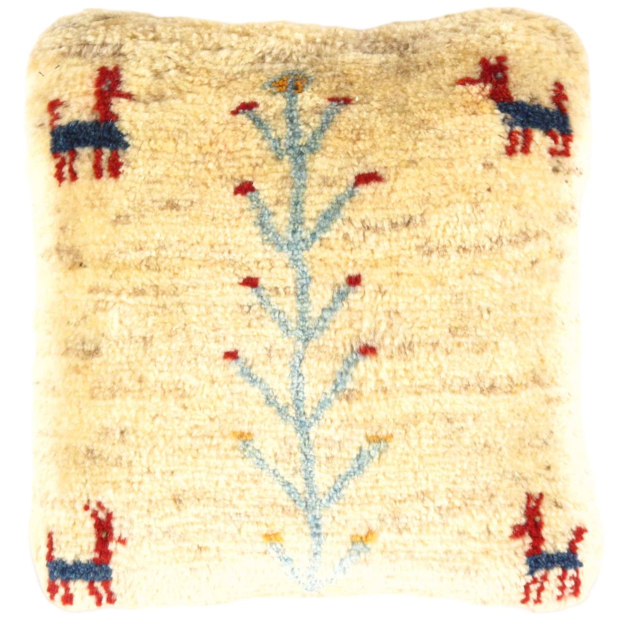 The word “Gabbeh” literally translates to “in the rough,” and it is an accurate description of this style of Persian rug. Gabbeh carpets are woven on makeshift ground looms constructed both of materials that are kept and hauled for long distances by the nomadic tribel, and also of materials that are found at each site where the tribe sets up camp. Due to the fact that part of the loom must be found at each site, a wide variety is introduced. Thus, these rugs are usually somewhat irregular in shape. But, for what they lack in perfectly uniform shape they more than make up for in character, durability and uniqueness.This Gabbeh pillow is made of high-quality LAMBS WOOL The piece was crafted with good workmanship.