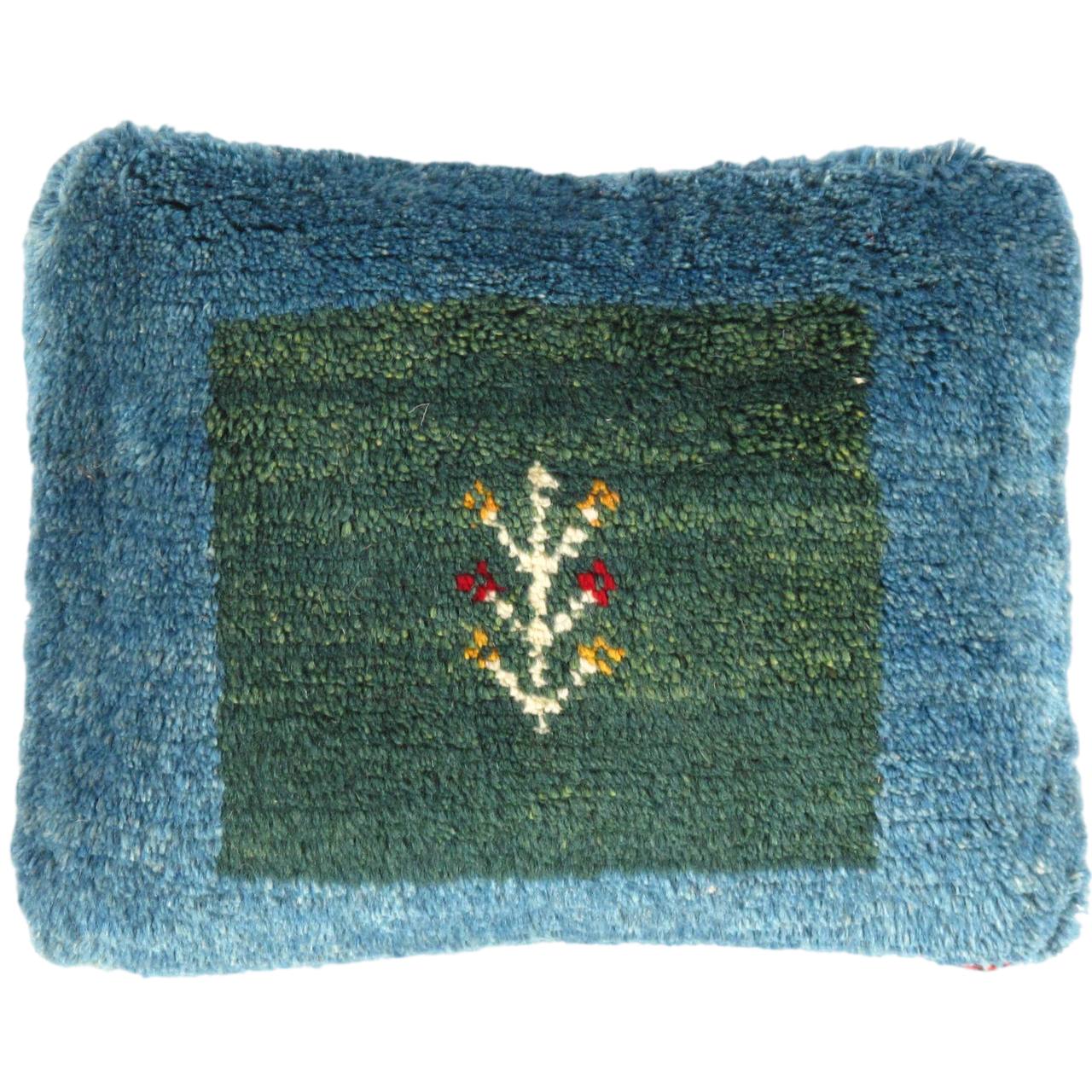 The word “Gabbeh” literally translates to “in the rough,” and it is an accurate description of this style of Persian rug. Gabbeh carpets are woven on makeshift ground looms constructed both of materials that are kept and hauled for long distances by the nomadic tribel, and also of materials that are found at each site where the tribe sets up camp. Due to the fact that part of the loom must be found at each site, a wide variety is introduced. Thus, these rugs are usually somewhat irregular in shape. But, for what they lack in perfectly uniform shape they more than make up for in character, durability and uniqueness.This Gabbeh pillow is made of high-quality LAMBS WOOL The piece was crafted with good workmanship.