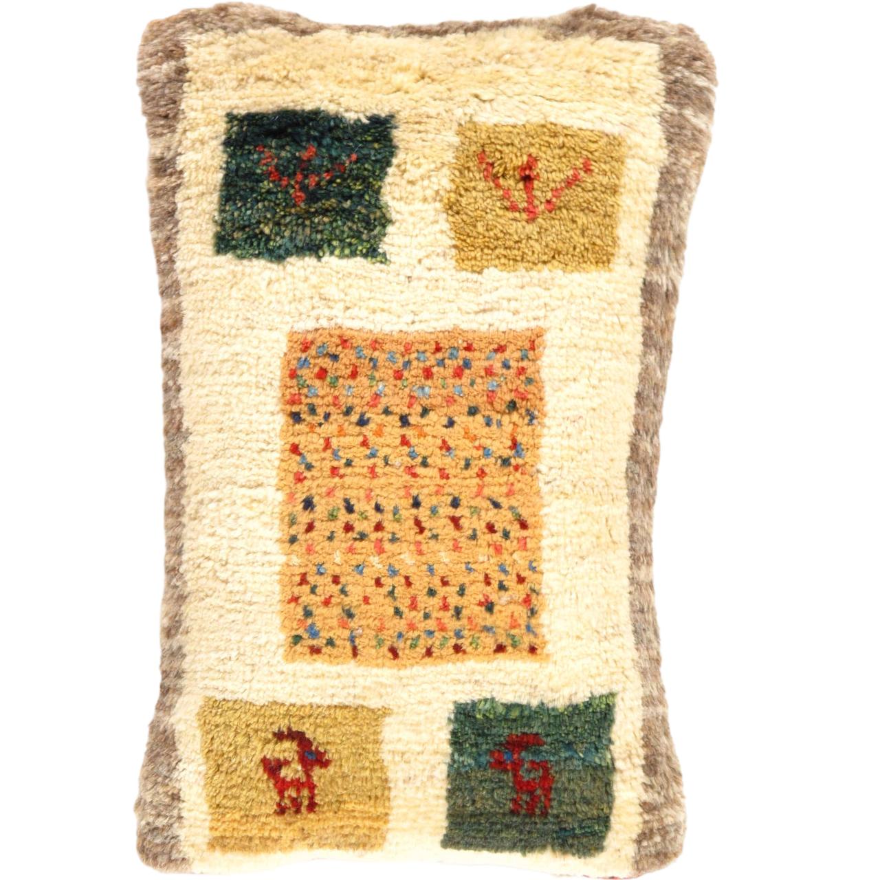 The word “Gabbeh” literally translates to “in the rough,” and it is an accurate description of this style of Persian rug. Gabbeh carpets are woven on makeshift ground looms constructed both of materials that are kept and hauled for long distances by the nomadic tribel, and also of materials that are found at each site where the tribe sets up camp. Due to the fact that part of the loom must be found at each site, a wide variety is introduced. Thus, these rugs are usually somewhat irregular in shape. But, for what they lack in perfectly uniform shape they more than make up for in character, durability and uniqueness.This Gabbeh pillow is made of high-quality LAMBS WOOL The piece was crafted with good workmanship.