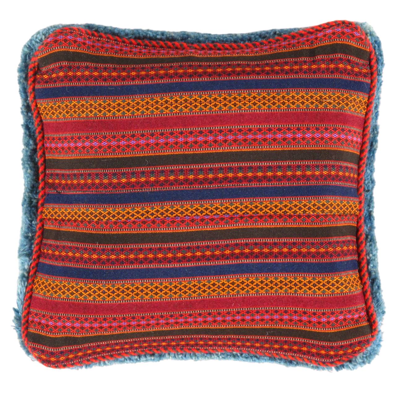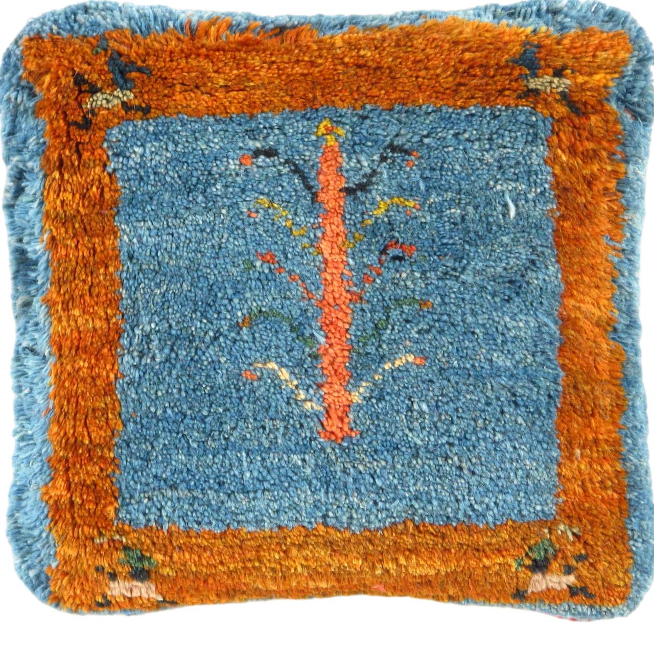 The word “Gabbeh” literally translates to “in the rough,” and it is an accurate description of this style of Persian rug. Gabbeh carpets are woven on makeshift ground looms constructed both of materials that are kept and hauled for long distances by the nomadic tribel, and also of materials that are found at each site where the tribe sets up camp. Due to the fact that part of the loom must be found at each site, a wide variety is introduced. Thus, these rugs are usually somewhat irregular in shape. But, for what they lack in perfectly uniform shape they more than make up for in character, durability and uniqueness.This Gabbeh pillow is made of high-quality LAMBS WOOL The piece was crafted with good workmanship.
