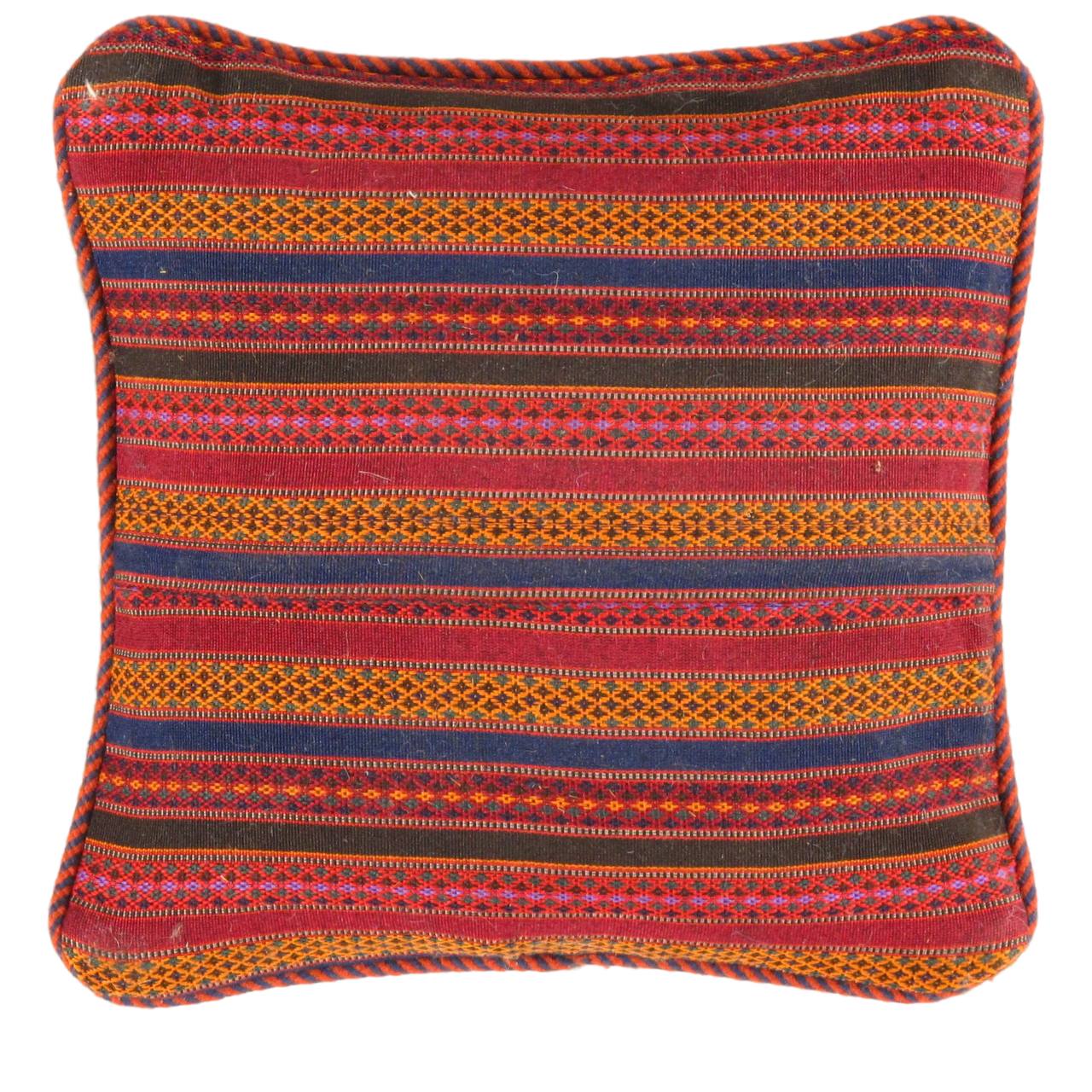 The word “Gabbeh” literally translates to “in the rough,” and it is an accurate description of this style of Persian rug. Gabbeh carpets are woven on makeshift ground looms constructed both of materials that are kept and hauled for long distances by the nomadic tribel, and also of materials that are found at each site where the tribe sets up camp. Due to the fact that part of the loom must be found at each site, a wide variety is introduced. Thus, these rugs are usually somewhat irregular in shape. But, for what they lack in perfectly uniform shape they more than make up for in character, durability and uniqueness.This Gabbeh pillow is made of high-quality LAMBS WOOL The piece was crafted with good workmanship.