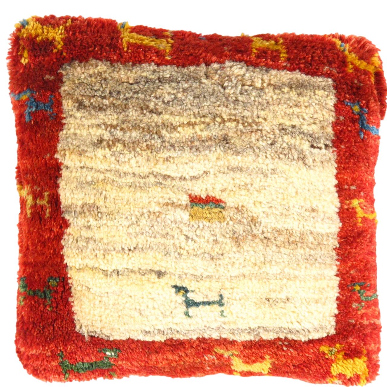 The word “Gabbeh” literally translates to “in the rough,” and it is an accurate description of this style of Persian rug. Gabbeh carpets are woven on makeshift ground looms constructed both of materials that are kept and hauled for long distances by the nomadic tribel, and also of materials that are found at each site where the tribe sets up camp. Due to the fact that part of the loom must be found at each site, a wide variety is introduced. Thus, these rugs are usually somewhat irregular in shape. But, for what they lack in perfectly uniform shape they more than make up for in character, durability and uniqueness.This Gabbeh pillow is made of high-quality LAMBS WOOL The piece was crafted with good workmanship.
