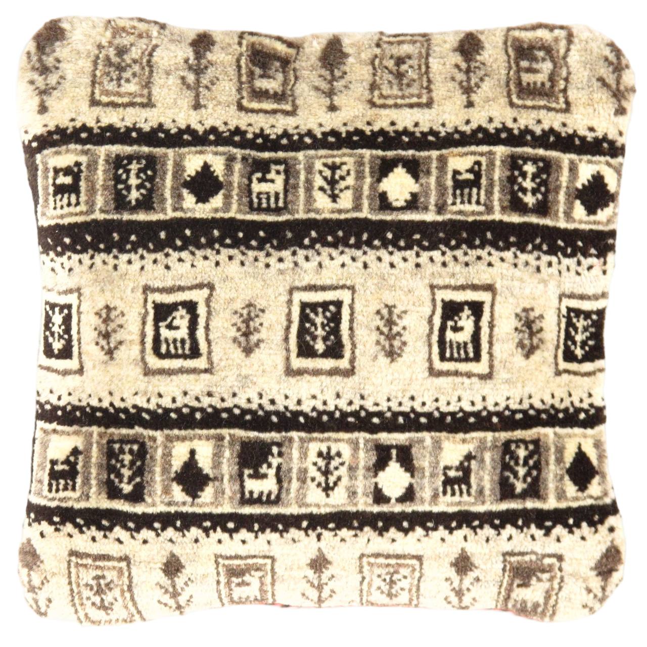 The word “Gabbeh” literally translates to “in the rough,” and it is an accurate description of this style of Persian rug. Gabbeh carpets are woven on makeshift ground looms constructed both of materials that are kept and hauled for long distances by the nomadic tribel, and also of materials that are found at each site where the tribe sets up camp. Due to the fact that part of the loom must be found at each site, a wide variety is introduced. Thus, these rugs are usually somewhat irregular in shape. But, for what they lack in perfectly uniform shape they more than make up for in character, durability and uniqueness.This Gabbeh pillow is made of high-quality LAMBS WOOL The piece was crafted with good workmanship.
