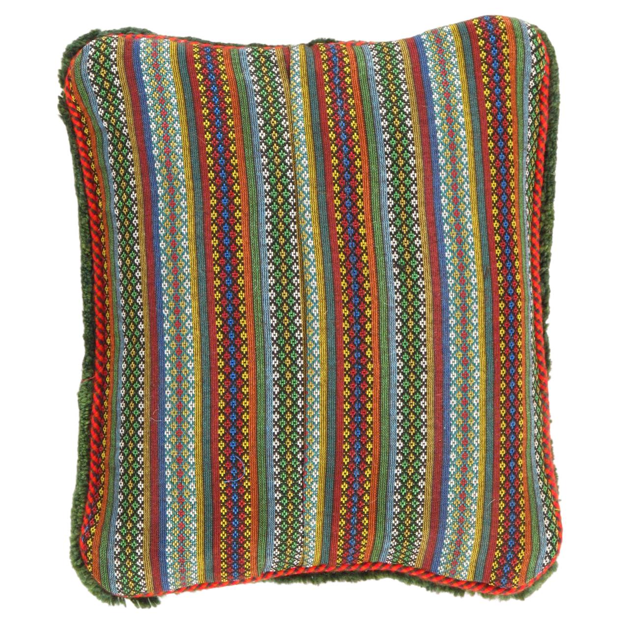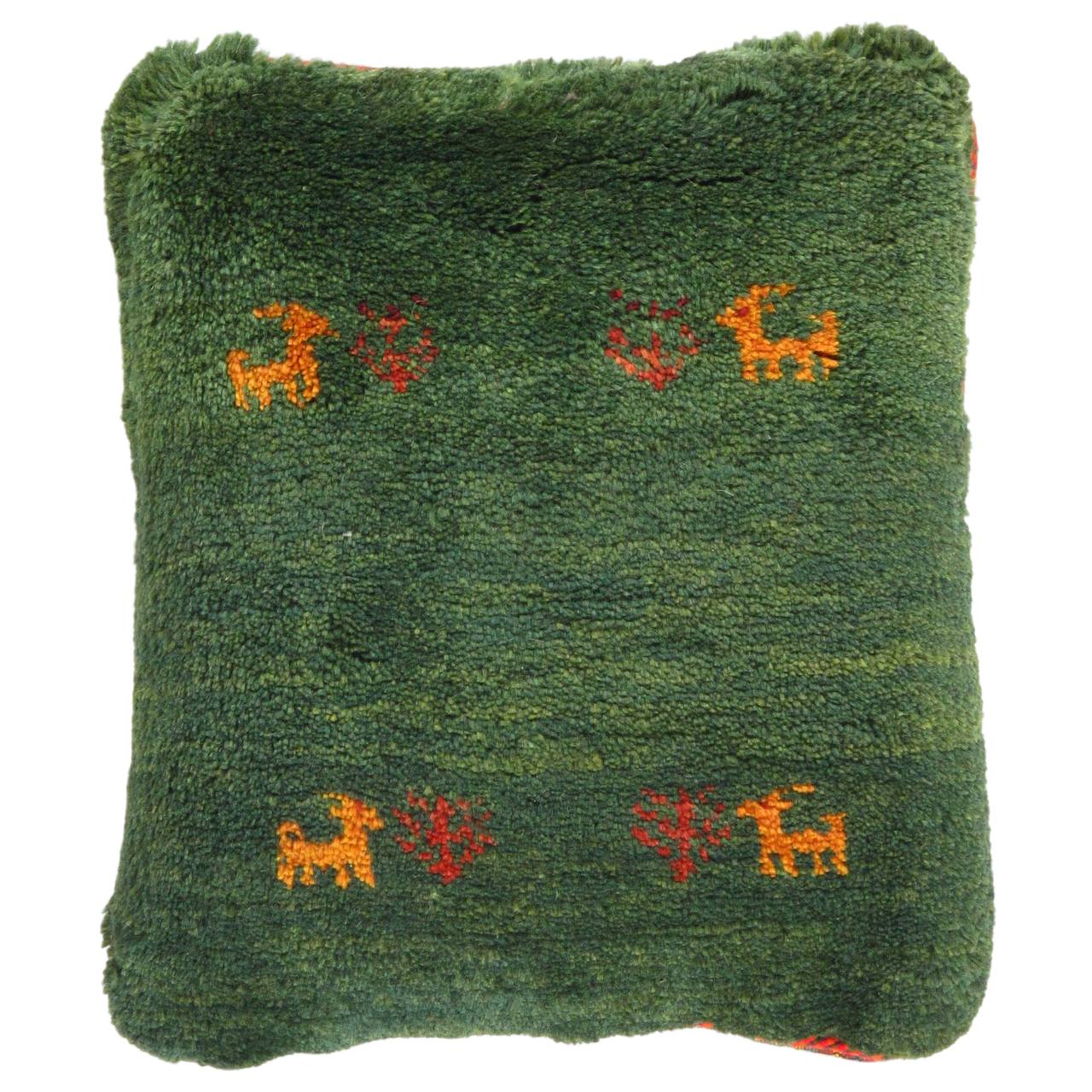 The word “Gabbeh” literally translates to “in the rough,” and it is an accurate description of this style of Persian rug. Gabbeh carpets are woven on makeshift ground looms constructed both of materials that are kept and hauled for long distances by the nomadic tribel, and also of materials that are found at each site where the tribe sets up camp. Due to the fact that part of the loom must be found at each site, a wide variety is introduced. Thus, these rugs are usually somewhat irregular in shape. But, for what they lack in perfectly uniform shape they more than make up for in character, durability and uniqueness.This Gabbeh pillow is made of high-quality LAMBS WOOL The piece was crafted with good workmanship.