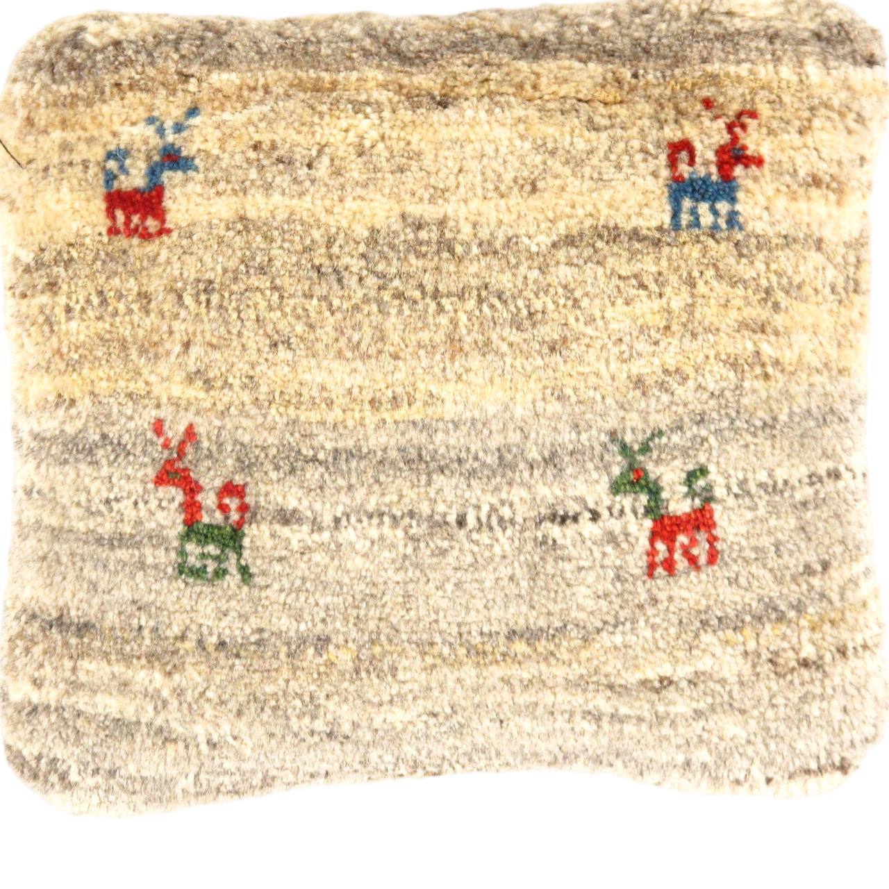 The word “Gabbeh” literally translates to “in the rough,” and it is an accurate description of this style of Persian rug. Gabbeh carpets are woven on makeshift ground looms constructed both of materials that are kept and hauled for long distances by the nomadic tribel, and also of materials that are found at each site where the tribe sets up camp. Due to the fact that part of the loom must be found at each site, a wide variety is introduced. Thus, these rugs are usually somewhat irregular in shape. But, for what they lack in perfectly uniform shape they more than make up for in character, durability and uniqueness.This Gabbeh pillow is made of high-quality LAMBS WOOL The piece was crafted with good workmanship.