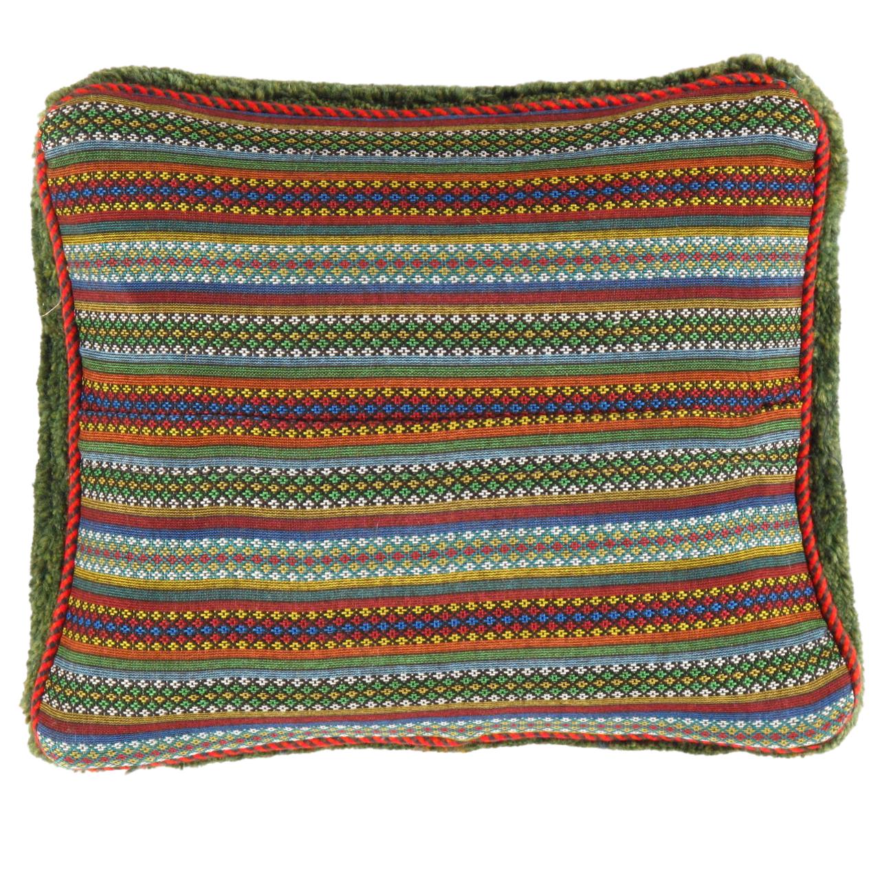 The word “Gabbeh” literally translates to “in the rough,” and it is an accurate description of this style of Persian rug. Gabbeh carpets are woven on makeshift ground looms constructed both of materials that are kept and hauled for long distances by the nomadic tribel, and also of materials that are found at each site where the tribe sets up camp. Due to the fact that part of the loom must be found at each site, a wide variety is introduced. Thus, these rugs are usually somewhat irregular in shape. But, for what they lack in perfectly uniform shape they more than make up for in character, durability and uniqueness.This Gabbeh pillow is made of high-quality LAMBS WOOL The piece was crafted with good workmanship.