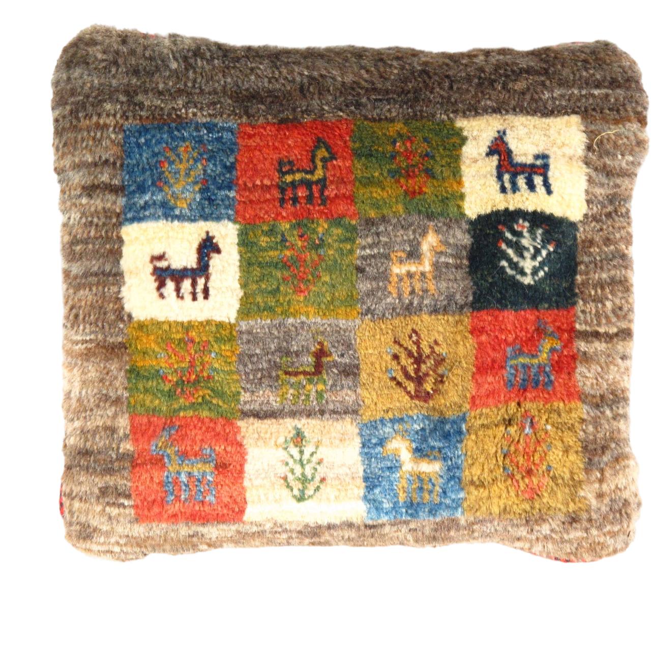 The word “Gabbeh” literally translates to “in the rough,” and it is an accurate description of this style of Persian rug. Gabbeh carpets are woven on makeshift ground looms constructed both of materials that are kept and hauled for long distances by the nomadic tribel, and also of materials that are found at each site where the tribe sets up camp. Due to the fact that part of the loom must be found at each site, a wide variety is introduced. Thus, these rugs are usually somewhat irregular in shape. But, for what they lack in perfectly uniform shape they more than make up for in character, durability and uniqueness.This Gabbeh pillow is made of high-quality LAMBS WOOL The piece was crafted with good workmanship.