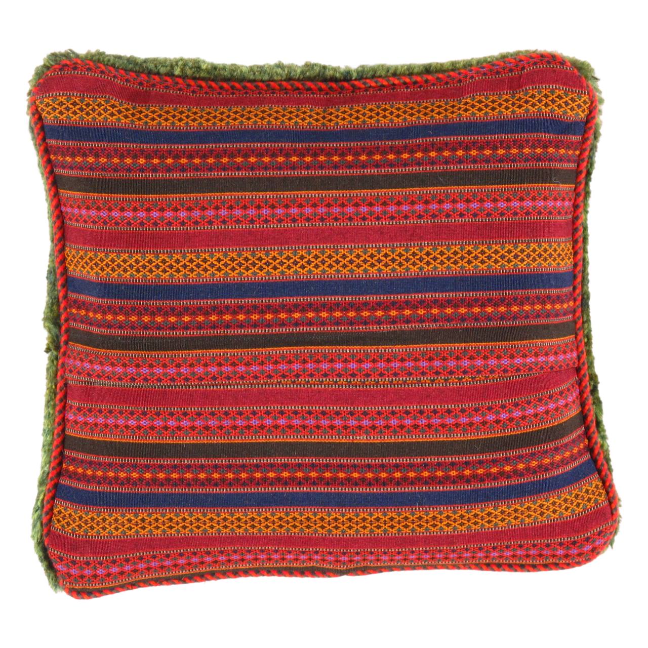 The word “Gabbeh” literally translates to “in the rough,” and it is an accurate description of this style of Persian rug. Gabbeh carpets are woven on makeshift ground looms constructed both of materials that are kept and hauled for long distances by the nomadic tribel, and also of materials that are found at each site where the tribe sets up camp. Due to the fact that part of the loom must be found at each site, a wide variety is introduced. Thus, these rugs are usually somewhat irregular in shape. But, for what they lack in perfectly uniform shape they more than make up for in character, durability and uniqueness.This Gabbeh pillow is made of high-quality LAMBS WOOL The piece was crafted with good workmanship.