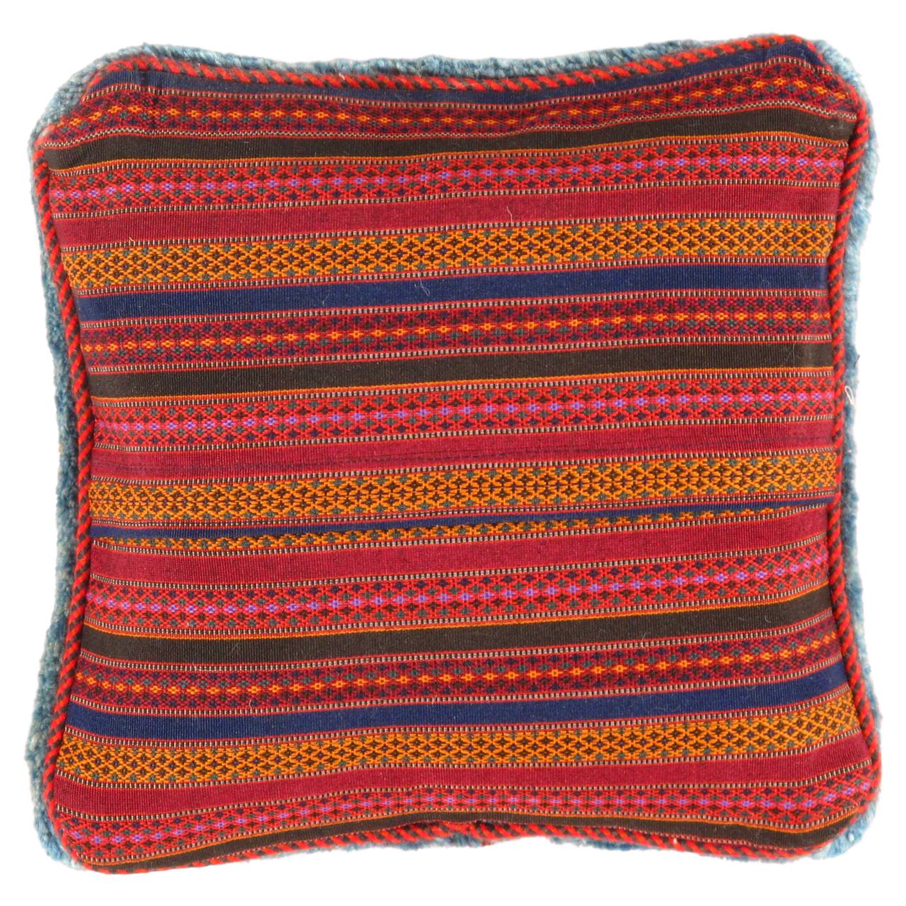 The word “Gabbeh” literally translates to “in the rough,” and it is an accurate description of this style of Persian rug. Gabbeh carpets are woven on makeshift ground looms constructed both of materials that are kept and hauled for long distances by the nomadic tribel, and also of materials that are found at each site where the tribe sets up camp. Due to the fact that part of the loom must be found at each site, a wide variety is introduced. Thus, these rugs are usually somewhat irregular in shape. But, for what they lack in perfectly uniform shape they more than make up for in character, durability and uniqueness.This Gabbeh pillow is made of high-quality LAMBS WOOL The piece was crafted with good workmanship.