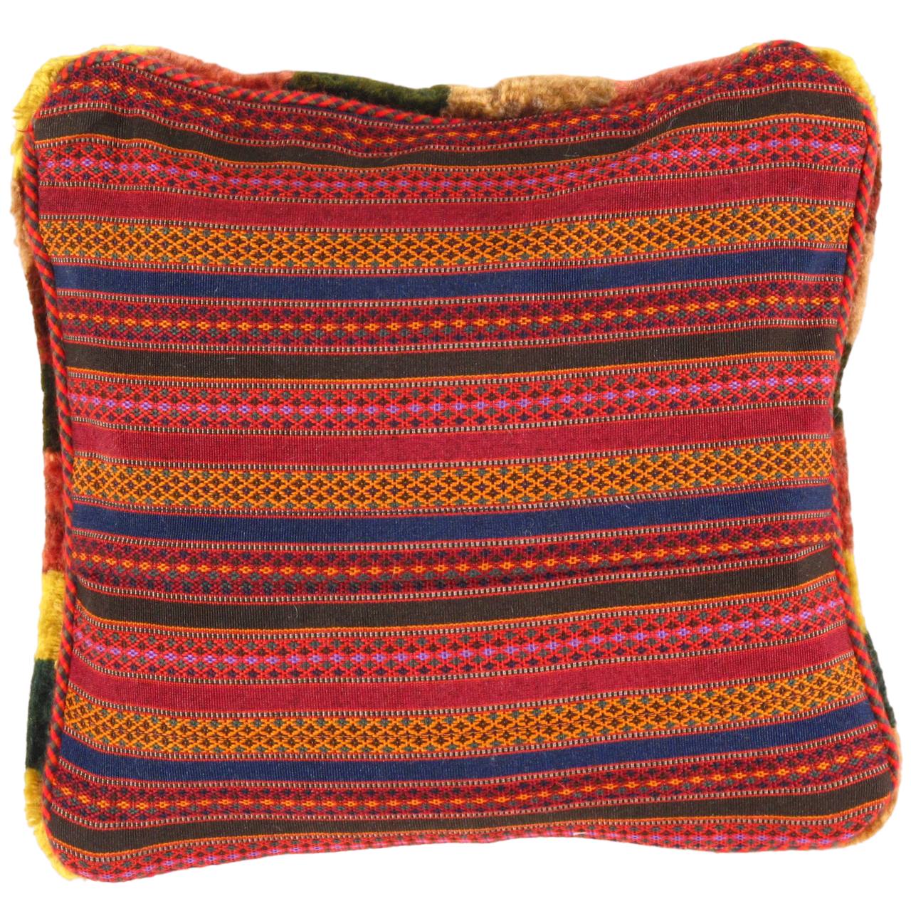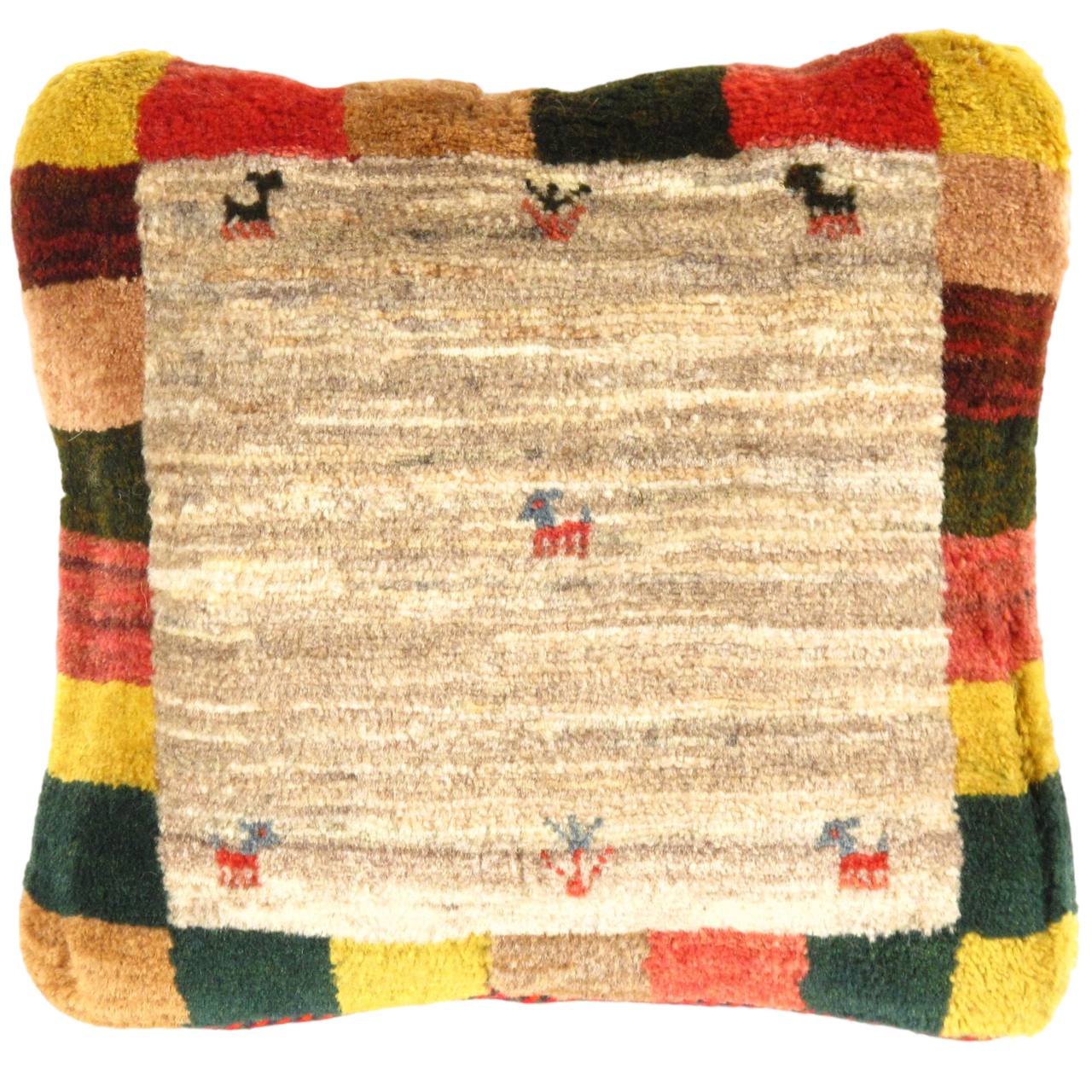 The word “Gabbeh” literally translates to “in the rough,” and it is an accurate description of this style of Persian rug. Gabbeh carpets are woven on makeshift ground looms constructed both of materials that are kept and hauled for long distances by the nomadic tribel, and also of materials that are found at each site where the tribe sets up camp. Due to the fact that part of the loom must be found at each site, a wide variety is introduced. Thus, these rugs are usually somewhat irregular in shape. But, for what they lack in perfectly uniform shape they more than make up for in character, durability and uniqueness.This Gabbeh pillow is made of high-quality LAMBS WOOL The piece was crafted with good workmanship.