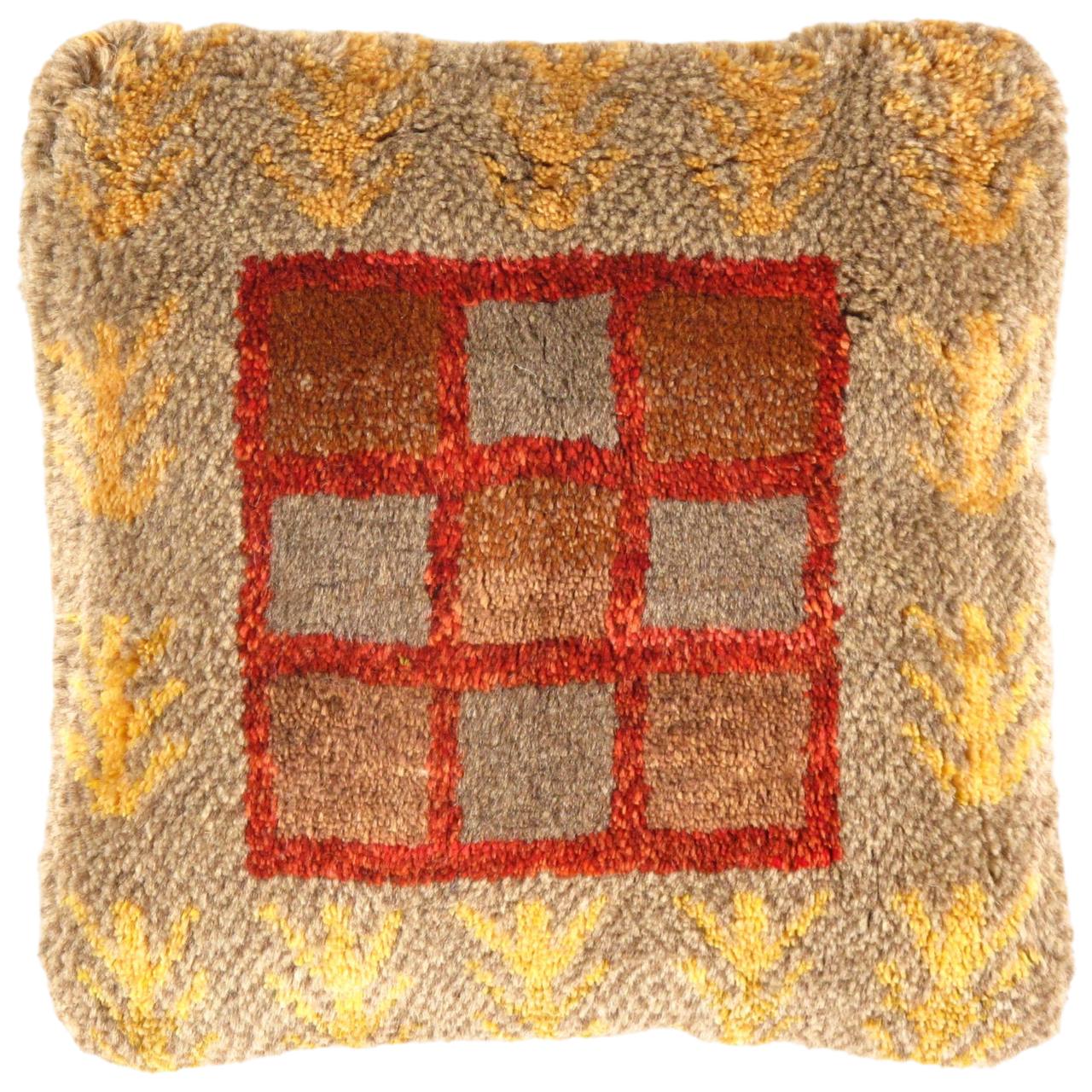 The word “Gabbeh” literally translates to “in the rough,” and it is an accurate description of this style of Persian rug. Gabbeh carpets are woven on makeshift ground looms constructed both of materials that are kept and hauled for long distances by the nomadic tribel, and also of materials that are found at each site where the tribe sets up camp. Due to the fact that part of the loom must be found at each site, a wide variety is introduced. Thus, these rugs are usually somewhat irregular in shape. But, for what they lack in perfectly uniform shape they more than make up for in character, durability and uniqueness.This Gabbeh pillow is made of high-quality LAMBS WOOL The piece was crafted with good workmanship.
