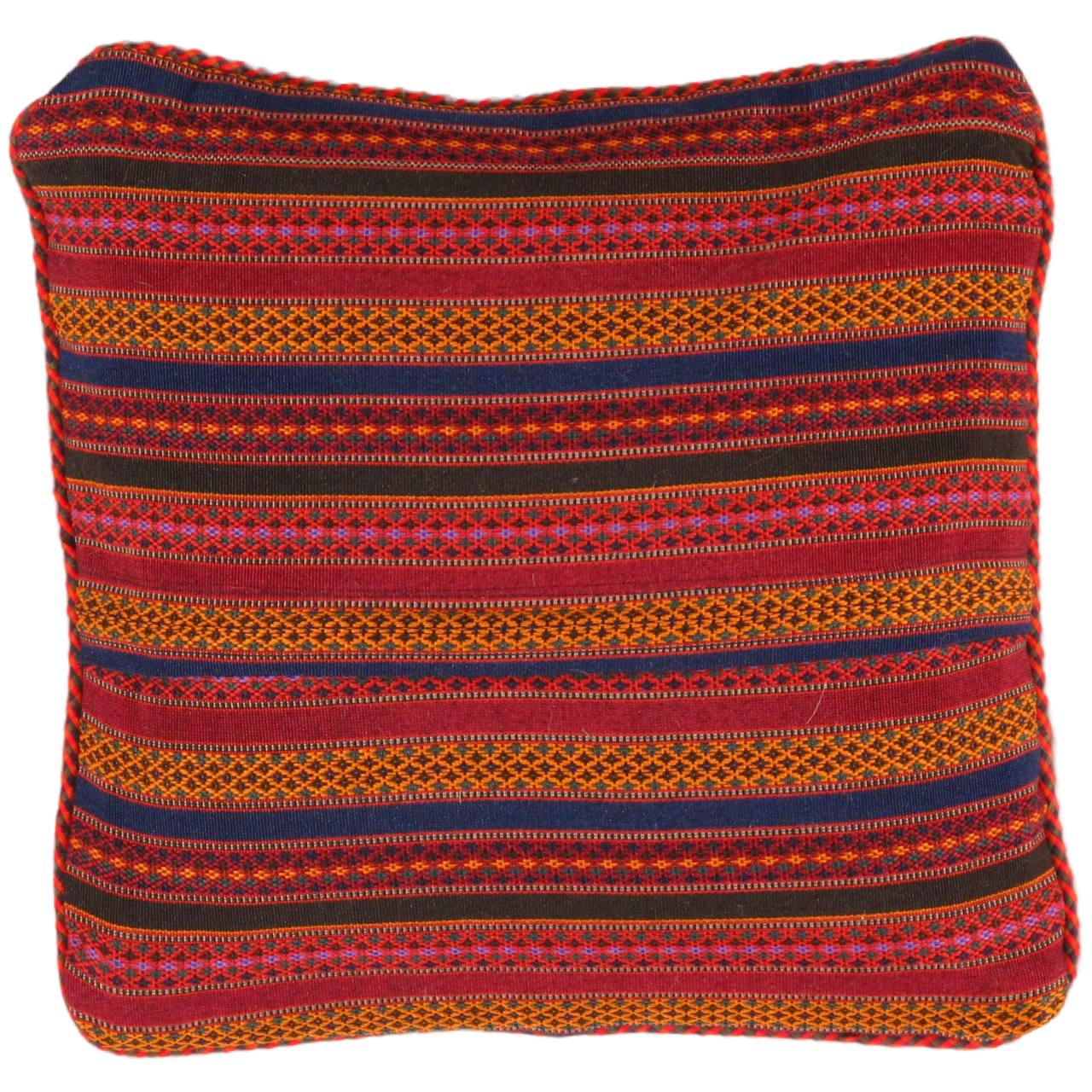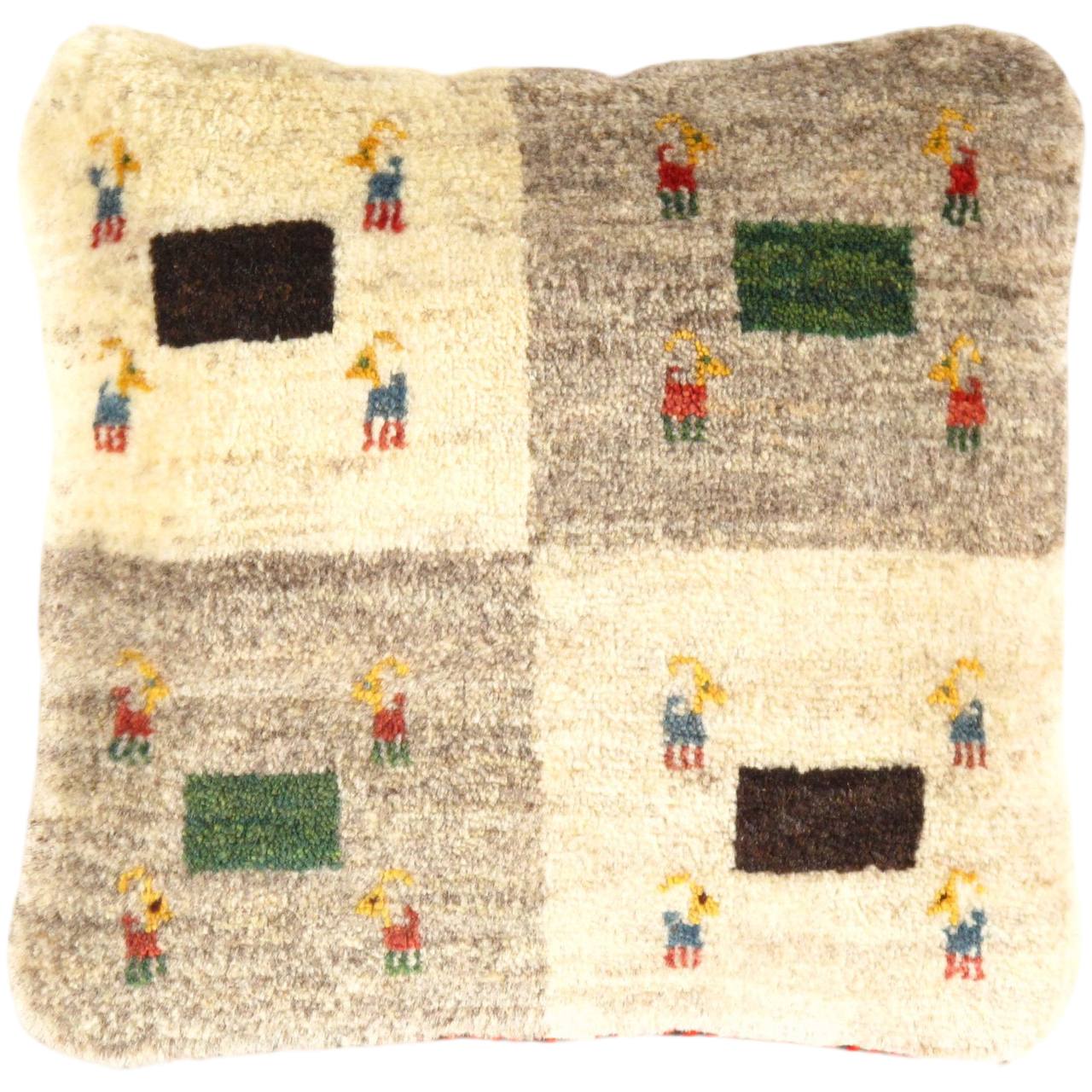 The word “Gabbeh” literally translates to “in the rough,” and it is an accurate description of this style of Persian rug. Gabbeh carpets are woven on makeshift ground looms constructed both of materials that are kept and hauled for long distances by the nomadic tribel, and also of materials that are found at each site where the tribe sets up camp. Due to the fact that part of the loom must be found at each site, a wide variety is introduced. Thus, these rugs are usually somewhat irregular in shape. But, for what they lack in perfectly uniform shape they more than make up for in character, durability and uniqueness.This Gabbeh pillow is made of high-quality LAMBS WOOL The piece was crafted with good workmanship.