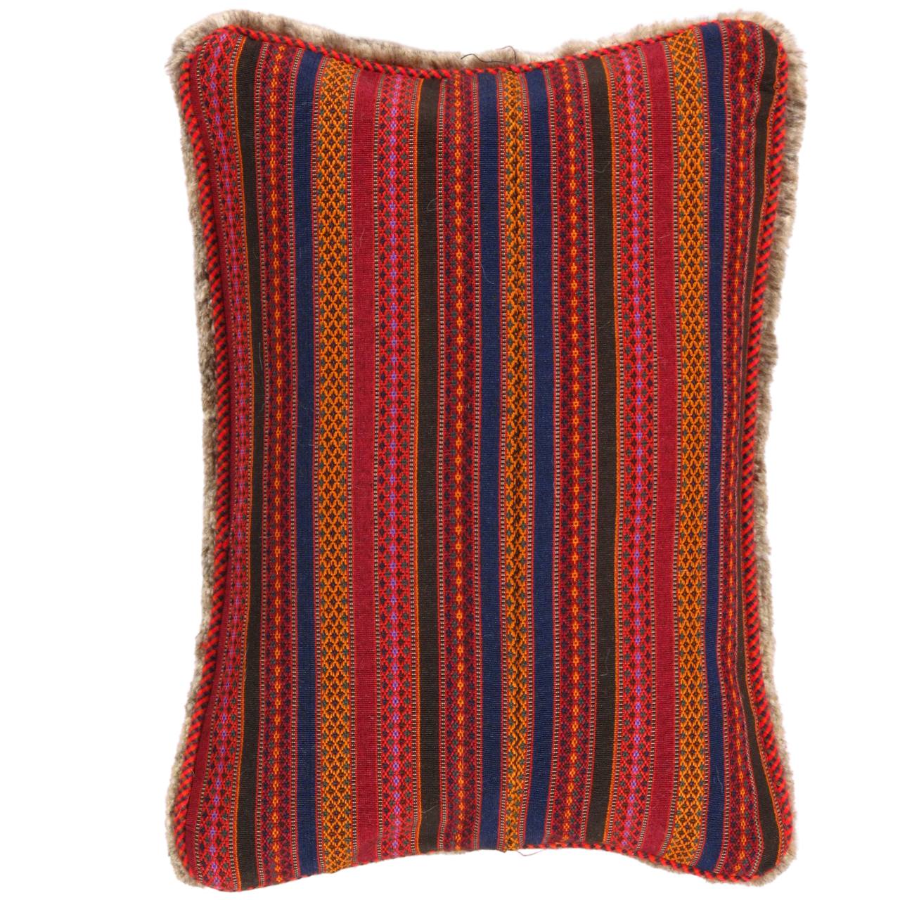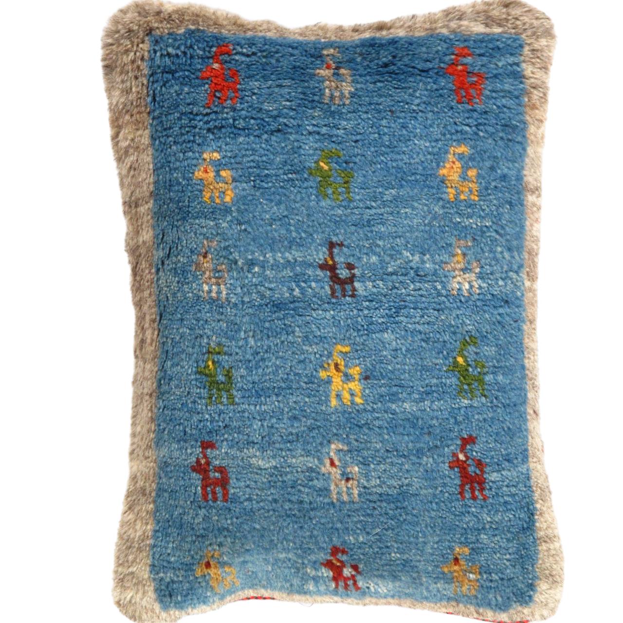 The word “Gabbeh” literally translates to “in the rough,” and it is an accurate description of this style of Persian rug. Gabbeh carpets are woven on makeshift ground looms constructed both of materials that are kept and hauled for long distances by the nomadic tribel, and also of materials that are found at each site where the tribe sets up camp. Due to the fact that part of the loom must be found at each site, a wide variety is introduced. Thus, these rugs are usually somewhat irregular in shape. But, for what they lack in perfectly uniform shape they more than make up for in character, durability and uniqueness.This Gabbeh pillow is made of high-quality LAMBS WOOL The piece was crafted with good workmanship.