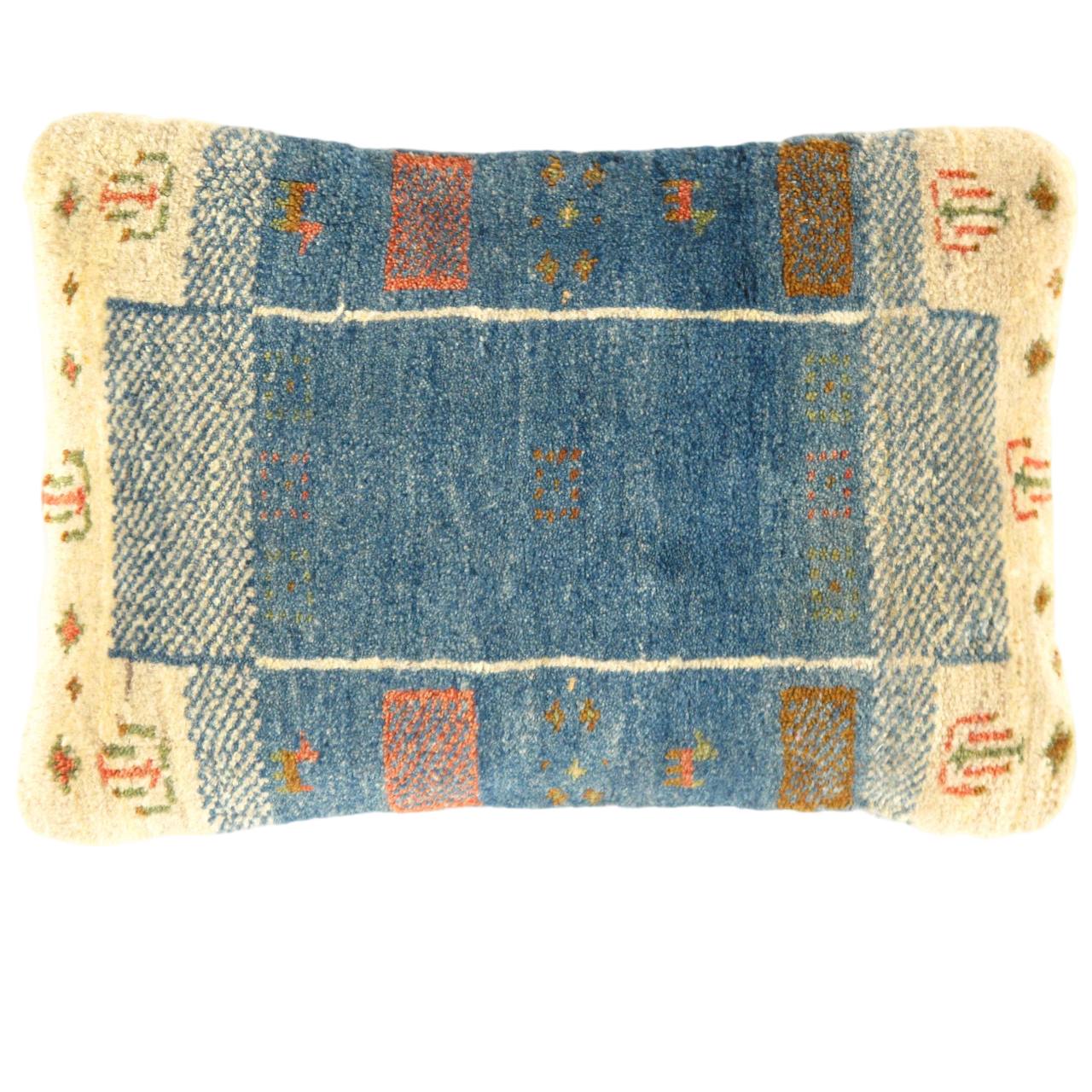 The word “Gabbeh” literally translates to “in the rough,” and it is an accurate description of this style of Persian rug. Gabbeh carpets are woven on makeshift ground looms constructed both of materials that are kept and hauled for long distances by the nomadic tribel, and also of materials that are found at each site where the tribe sets up camp. Due to the fact that part of the loom must be found at each site, a wide variety is introduced. Thus, these rugs are usually somewhat irregular in shape. But, for what they lack in perfectly uniform shape they more than make up for in character, durability and uniqueness.This Gabbeh pillow is made of high-quality LAMBS WOOL The piece was crafted with good workmanship.