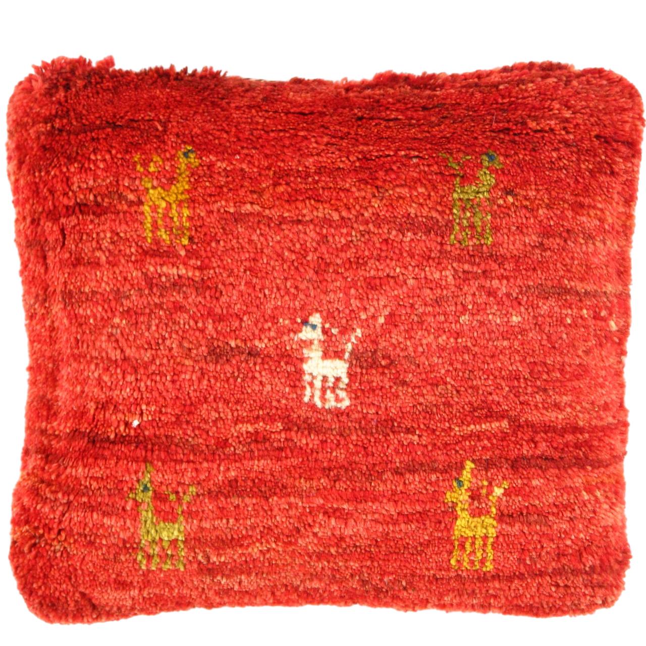The word “Gabbeh” literally translates to “in the rough,” and it is an accurate description of this style of Persian rug. Gabbeh carpets are woven on makeshift ground looms constructed both of materials that are kept and hauled for long distances by the nomadic tribel, and also of materials that are found at each site where the tribe sets up camp. Due to the fact that part of the loom must be found at each site, a wide variety is introduced. Thus, these rugs are usually somewhat irregular in shape. But, for what they lack in perfectly uniform shape they more than make up for in character, durability and uniqueness.This Gabbeh pillow is made of high-quality LAMBS WOOL The piece was crafted with good workmanship.