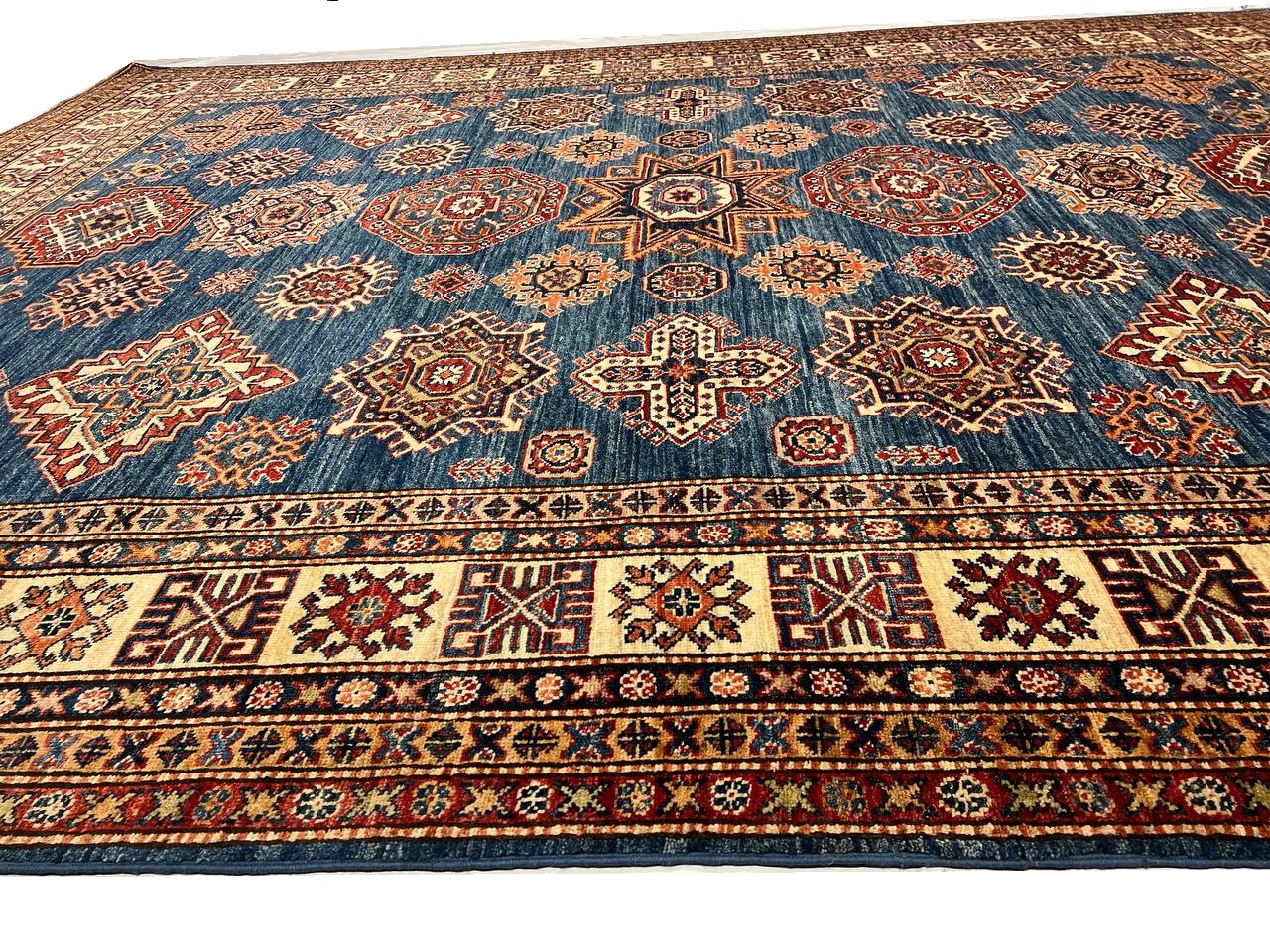 Kazak is a modern shape of old Caucasian rugs which strictly adheres to traditional design elements of the Caucasus. It has elements such as the stepped hooked polygons, geometrical medallions and rosettes, presented in more stylized manner and with a new dimension. Natural dyes produce soft luminous shades and abrashes causing a beautiful sheen. Handspun wool yarn is normally used in the variety of vibrant warm colors. Kazaks rugs in our collection are all fine quality pieces from Pakistan made with Ghazni handspun wool and natural dyes.