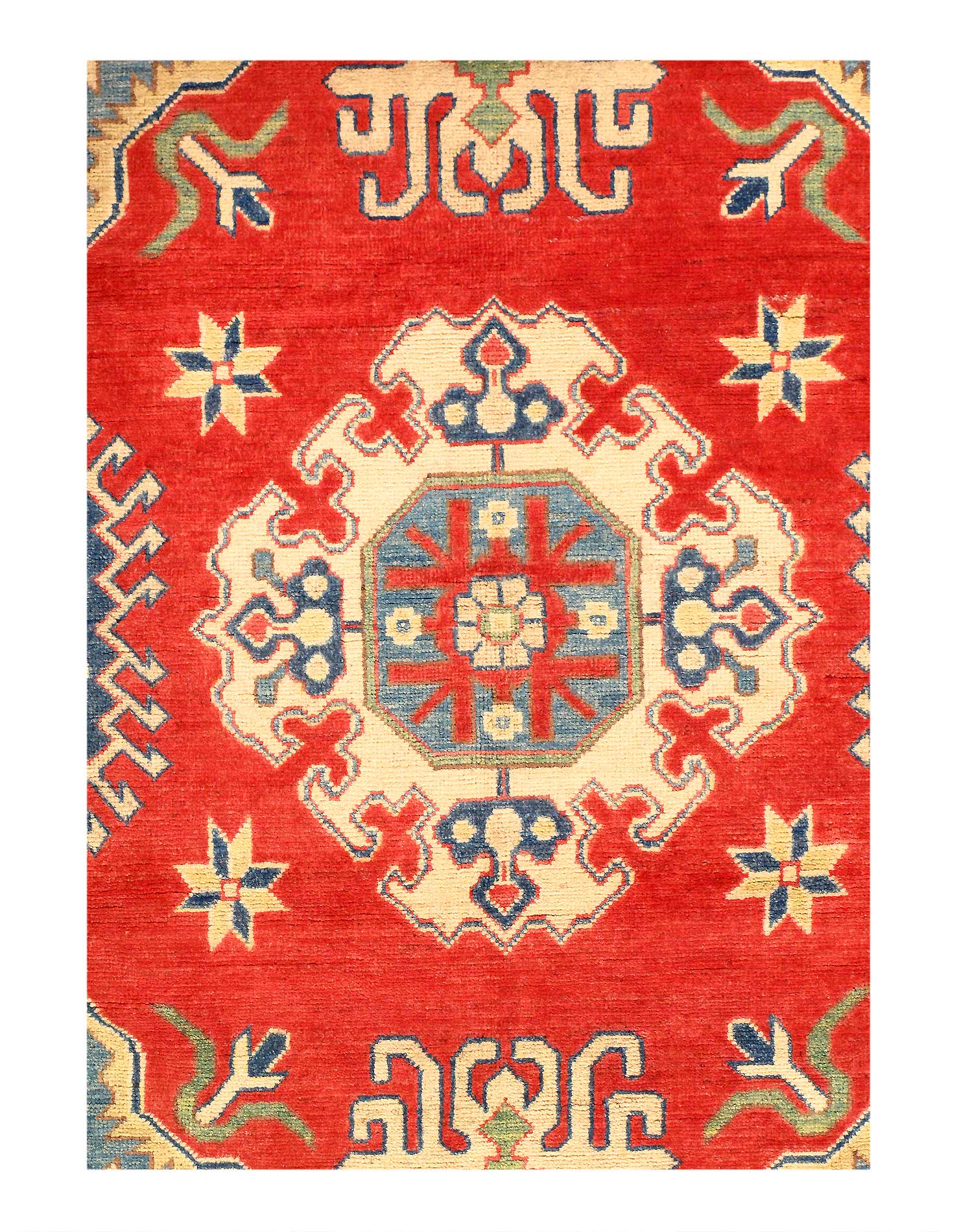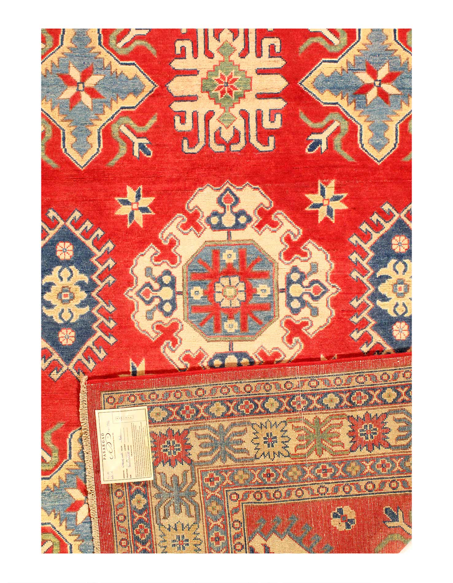 Kazak is a modern shape of old Caucasian rugs which strictly adheres to traditional design elements of the Caucasus. It has elements such as the stepped hooked polygons, geometrical medallions and rosettes, presented in more stylized manner and with a new dimension. Natural dyes produce soft luminous shades and abrashes causing a beautiful sheen. Handspun wool yarn is normally used in the variety of vibrant warm colors. Kazaks rugs in our collection are all fine quality pieces from Pakistan made with Ghazni handspun wool and natural dyes.