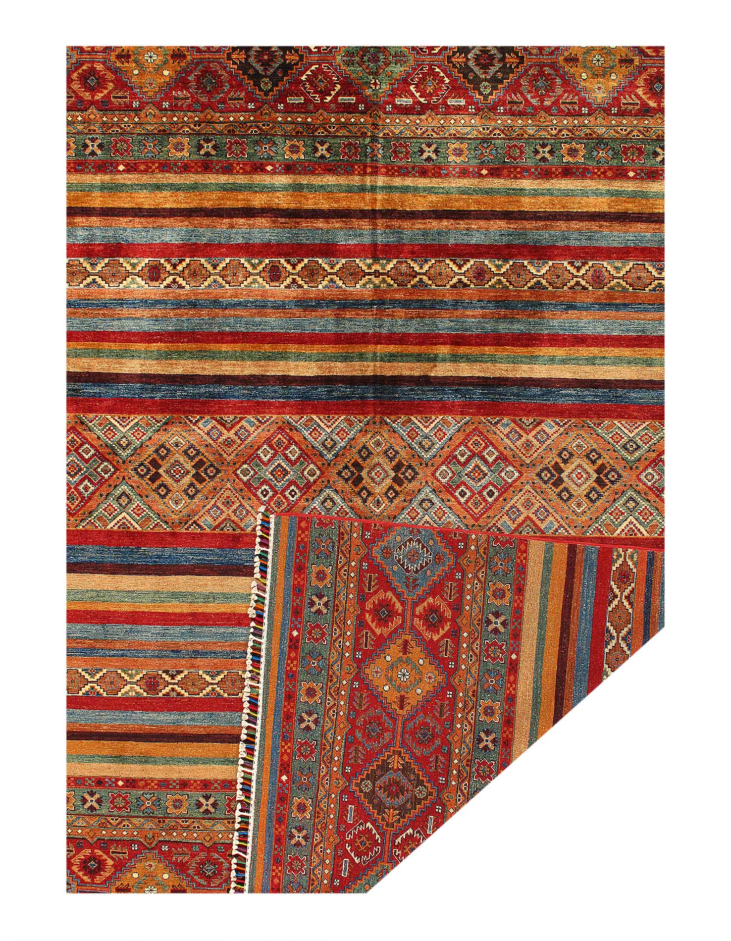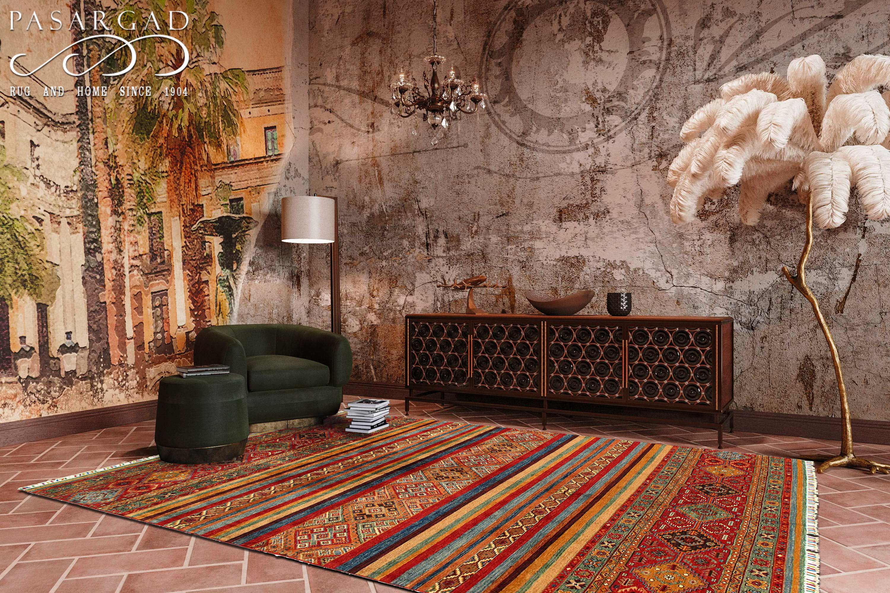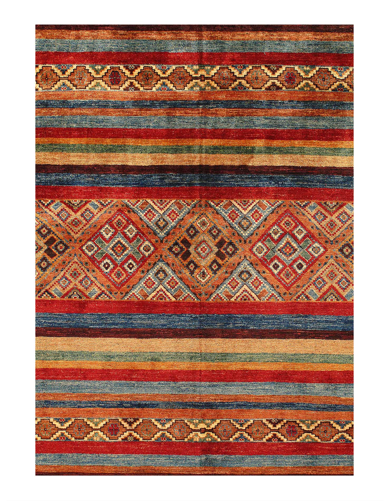 Kazak is a modern shape of old Caucasian rugs which strictly adheres to traditional design elements of the Caucasus. It has elements such as the stepped hooked polygons, geometrical medallions and rosettes, presented in more stylized manner and with a new dimension. Natural dyes produce soft luminous shades and abrashes causing a beautiful sheen. Handspun wool yarn is normally used in the variety of vibrant warm colors. Kazaks rugs in our collection are all fine quality pieces from Pakistan made with Ghazni handspun wool and natural dyes.