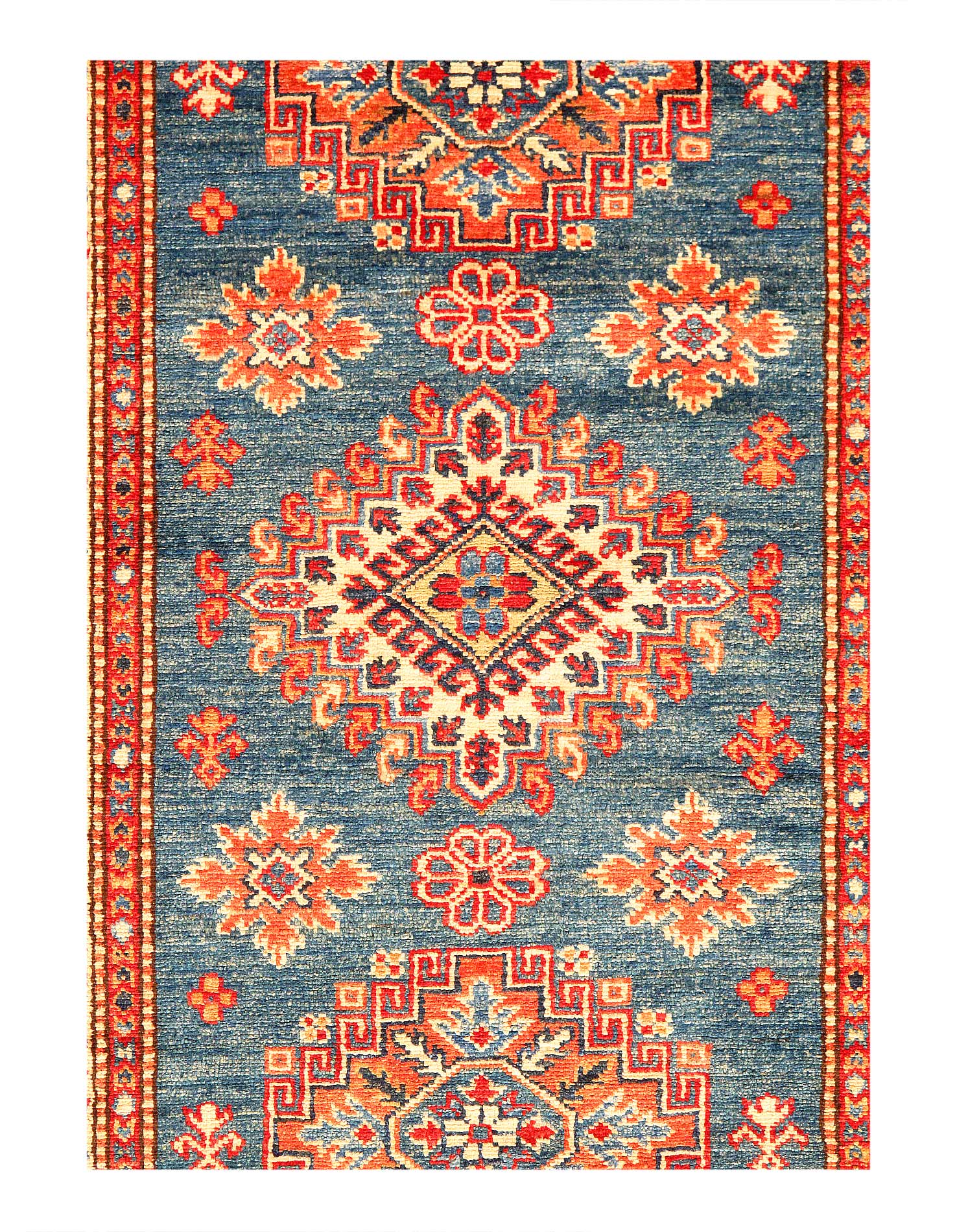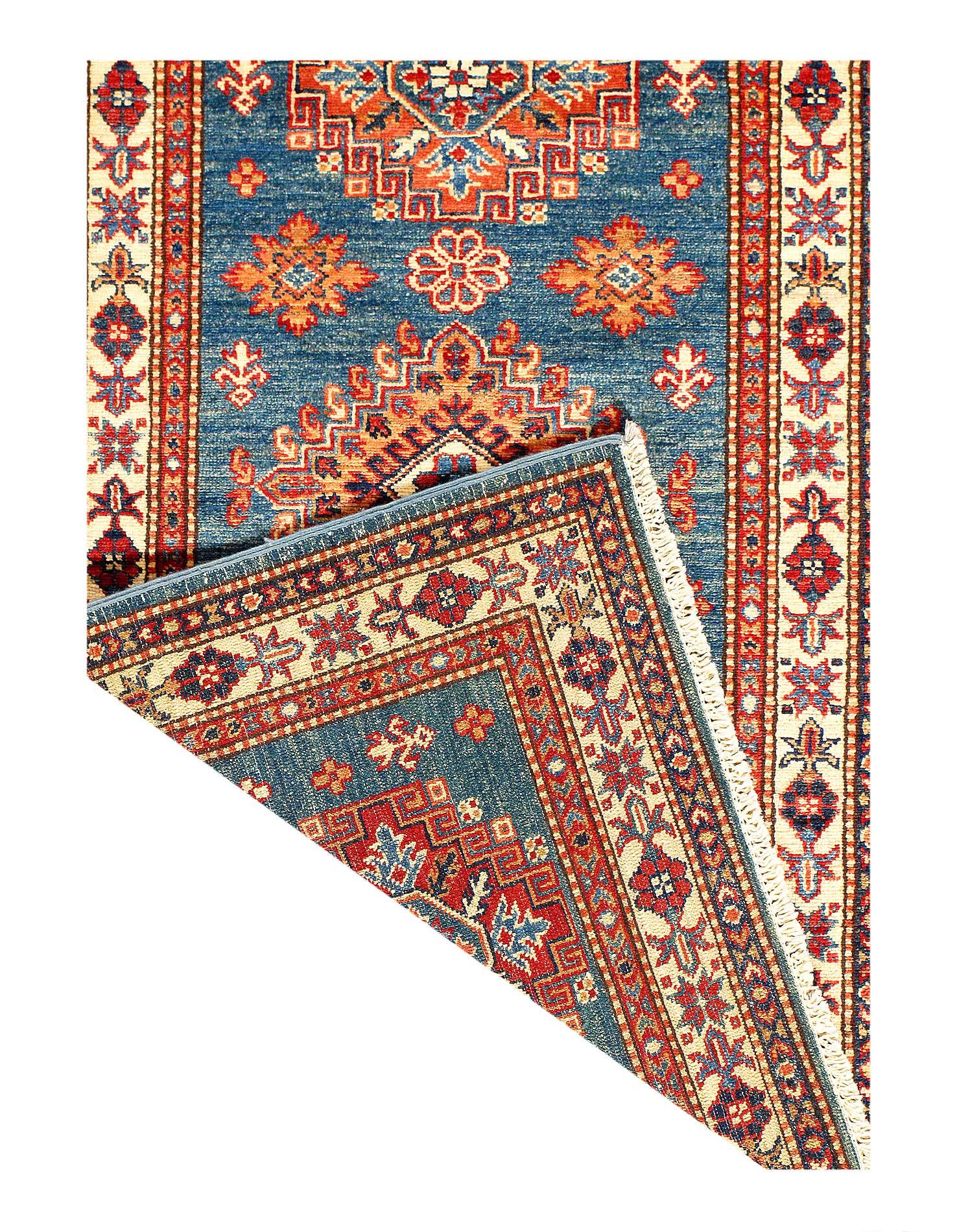 Kazak is a modern shape of old Caucasian rugs which strictly adheres to traditional design elements of the Caucasus. It has elements such as the stepped hooked polygons, geometrical medallions and rosettes, presented in more stylized manner and with a new dimension. Natural dyes produce soft luminous shades and abrashes causing a beautiful sheen. Handspun wool yarn is normally used in the variety of vibrant warm colors. Kazaks rugs in our collection are all fine quality pieces from Pakistan made with Ghazni handspun wool and natural dyes.