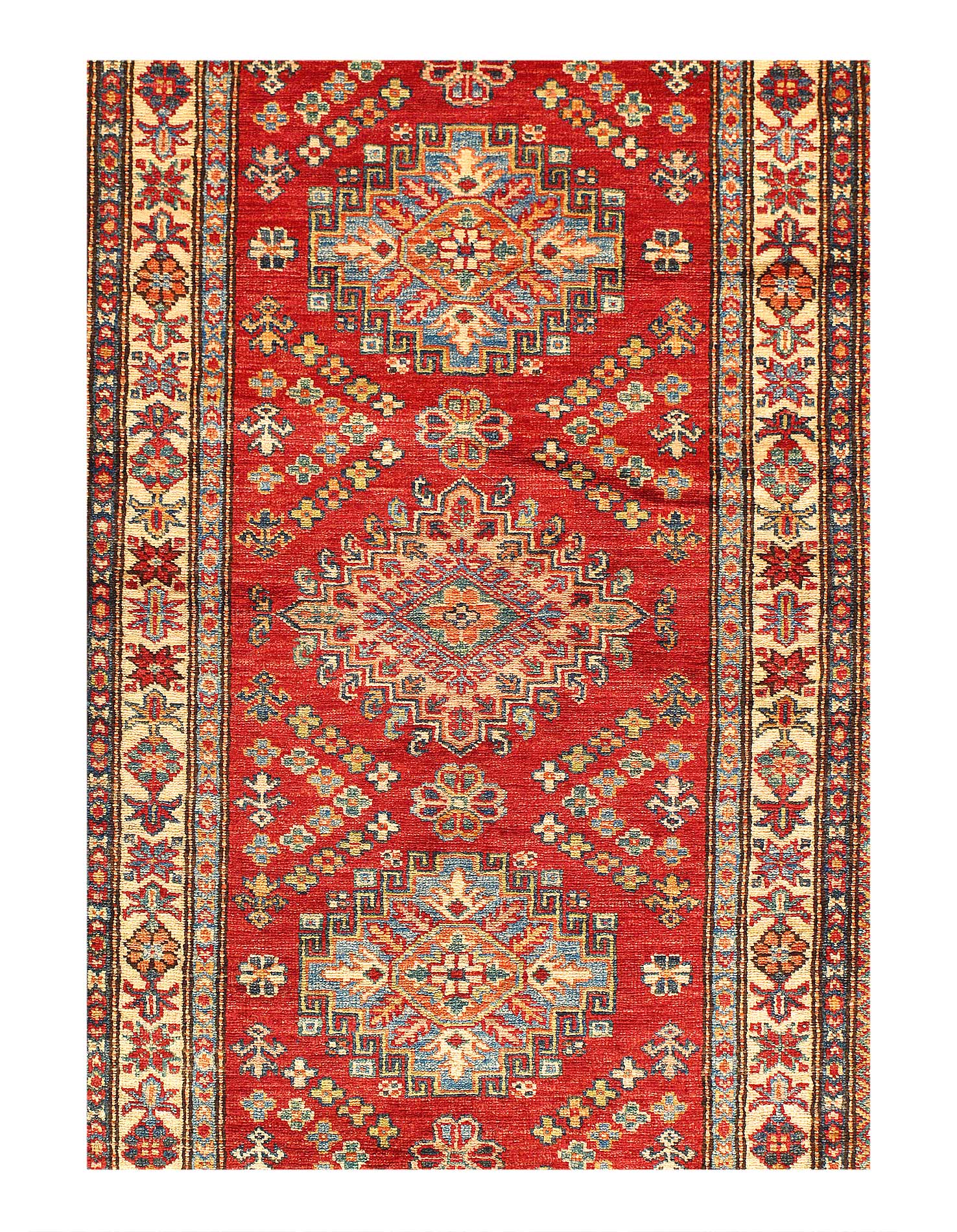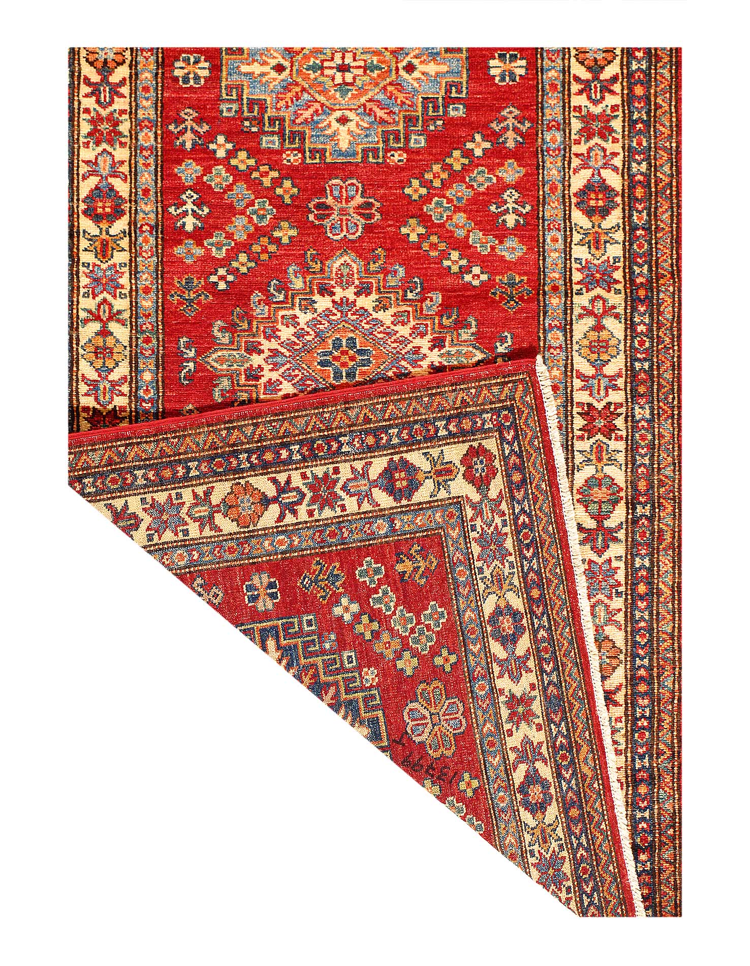Kazak is a modern shape of old Caucasian rugs which strictly adheres to traditional design elements of the Caucasus. It has elements such as the stepped hooked polygons, geometrical medallions and rosettes, presented in more stylized manner and with a new dimension. Natural dyes produce soft luminous shades and abrashes causing a beautiful sheen. Handspun wool yarn is normally used in the variety of vibrant warm colors. Kazaks rugs in our collection are all fine quality pieces from Pakistan made with Ghazni handspun wool and natural dyes.