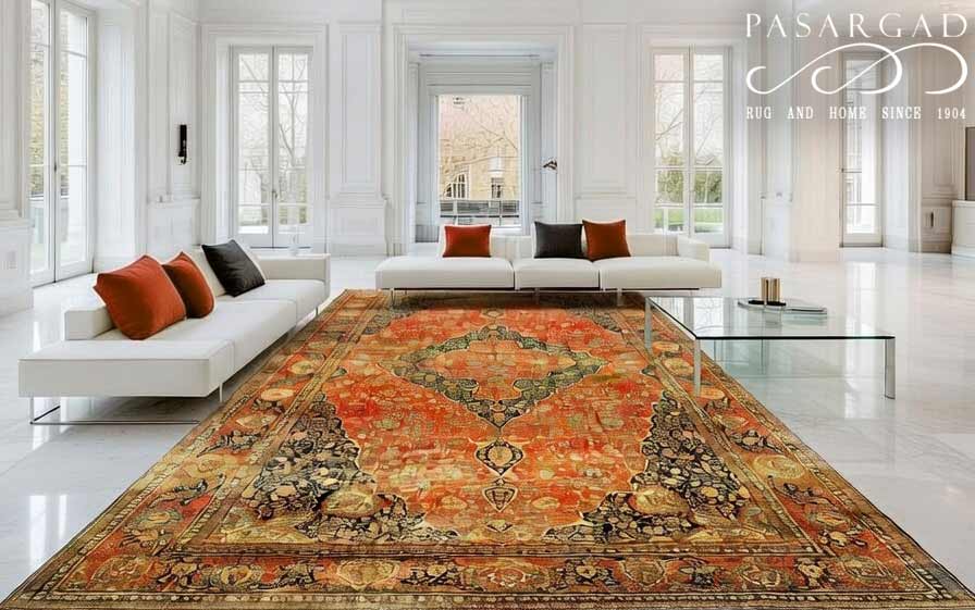 There were many master artists during the revival period, but we only know the names of a handful of them. Mohtasham is one of them. This rug is a large piece with a fine knot count. Rugs of this size and quality could take a team of weavers working under Mohtasham’s direction a year or more to create.