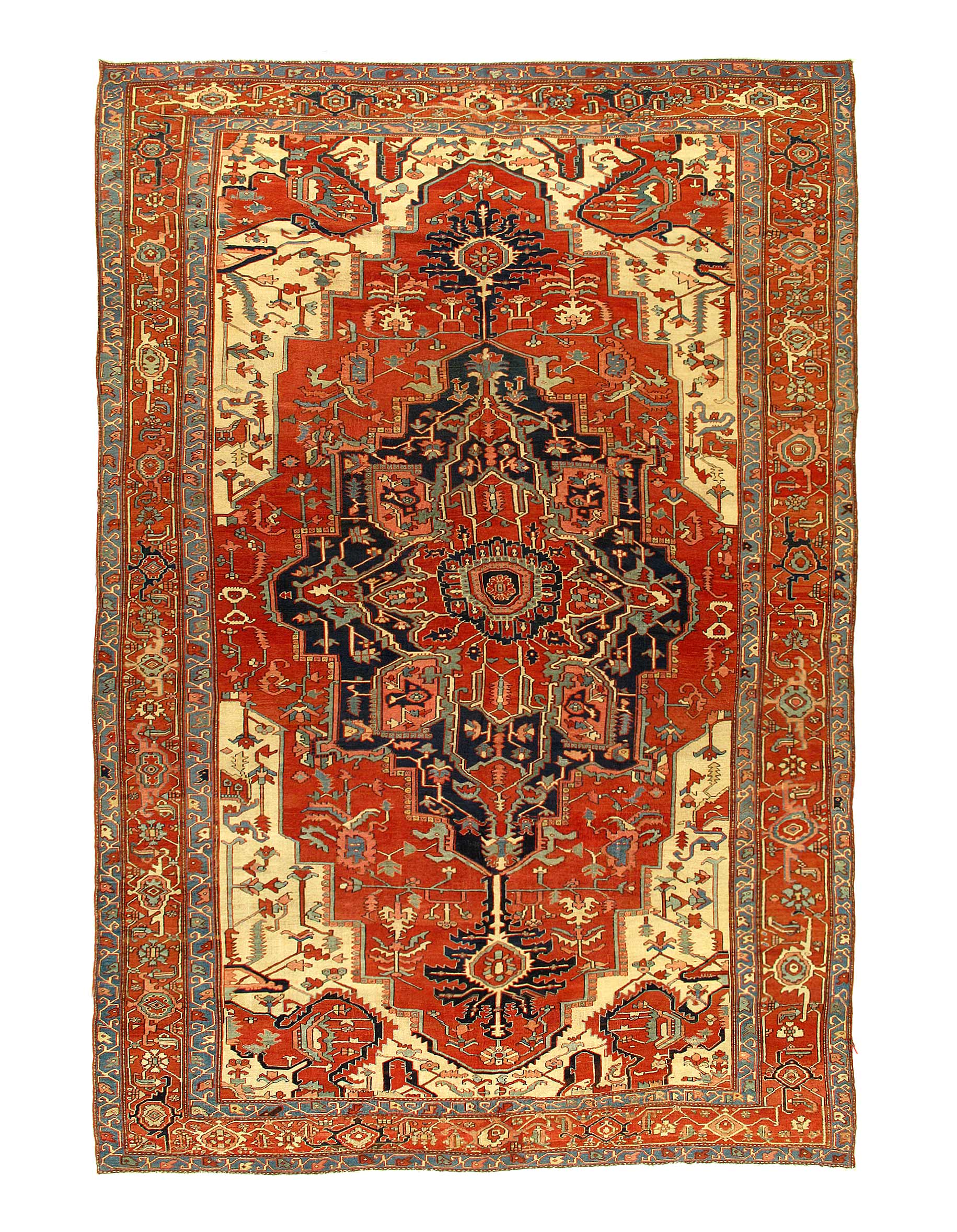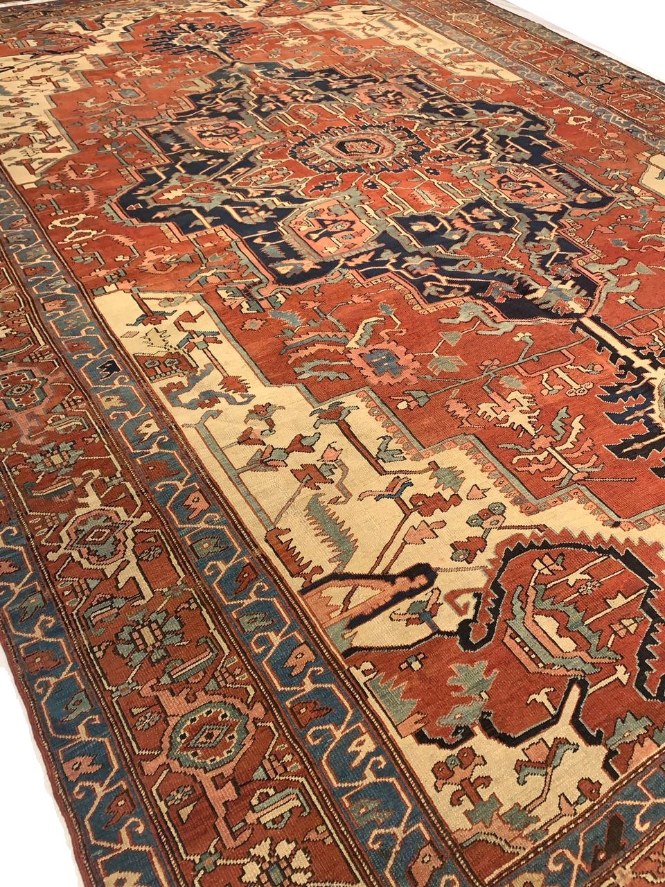 Beautiful Large Antique Persian Serapi Area Rug, Country of Origin: Persia, Circa date: 1920 – Antique Persian Heriz Serapi rugs include some of the most desirable Persian rugs in the world. This magnificent piece is an excellent example of the colors and designs that made these rugs an important part of interior design. Antique Persian Serapi rugs were favorites in the early days of the USA and were often found in state and federal buildings, including the White House.