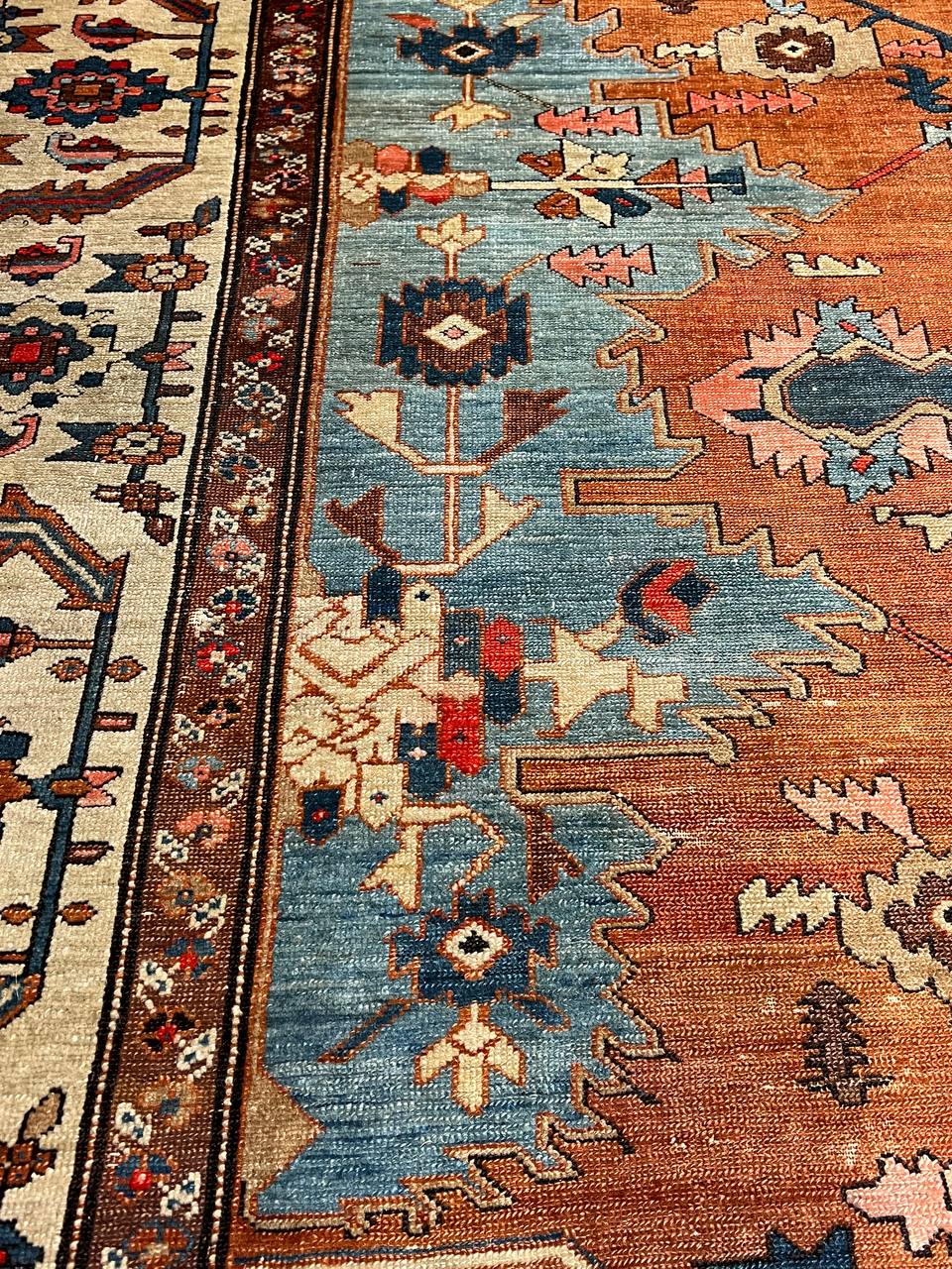 As is the case with the older and more interesting antique Persian Serapi carpets, this piece boasts a more open approach to the design. While there is a lot of pattern in this beautifully casual elegant rug, by adding more negative space between the different design elements, and using softer colors that we normally see, the weavers were able to make this piece feel open, happy and not at all busy.