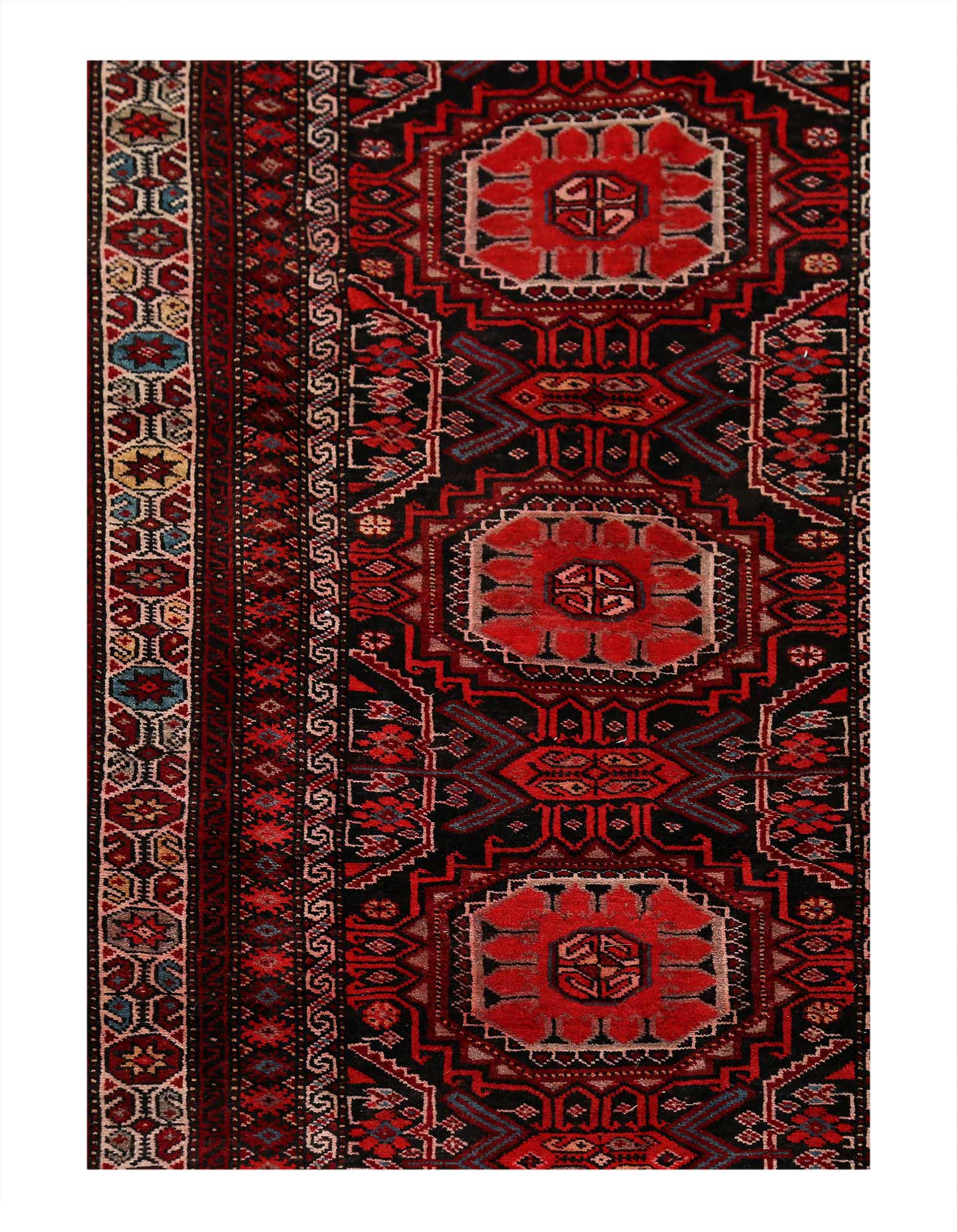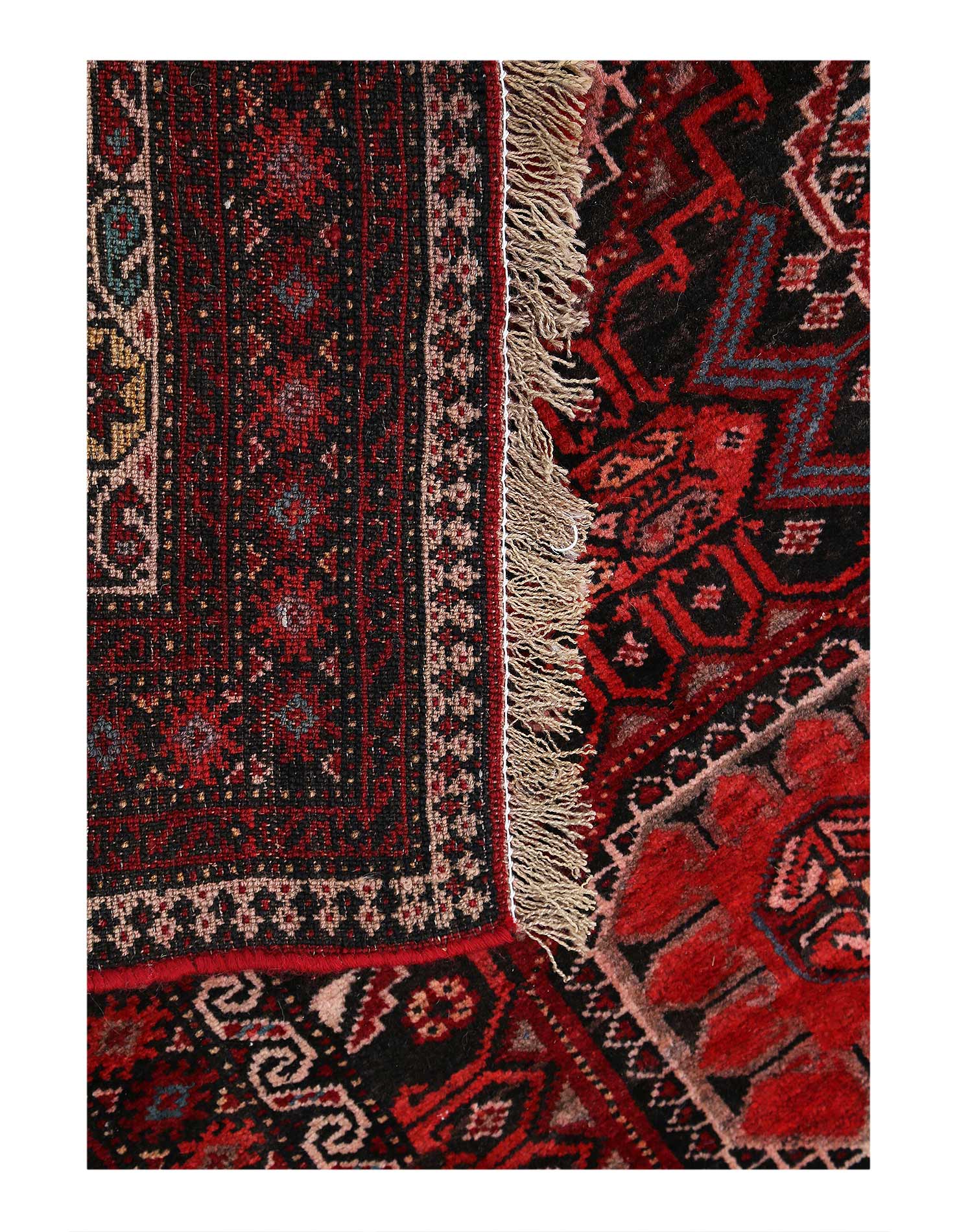 The Baluchi rugs woven in Iran have very geometric and intricate designs, borrowing largely from Turkoman tribal influences Traditional, Tribal style rug with Cream, Dark Navy, Red accent colors Imported from Iran and crafted using the finest weaving techniques Hand-knotted and constructed from 100% Wool with 100% Cotton foundation 3-Feet 7-Inch by 9-Feet 3-Inch