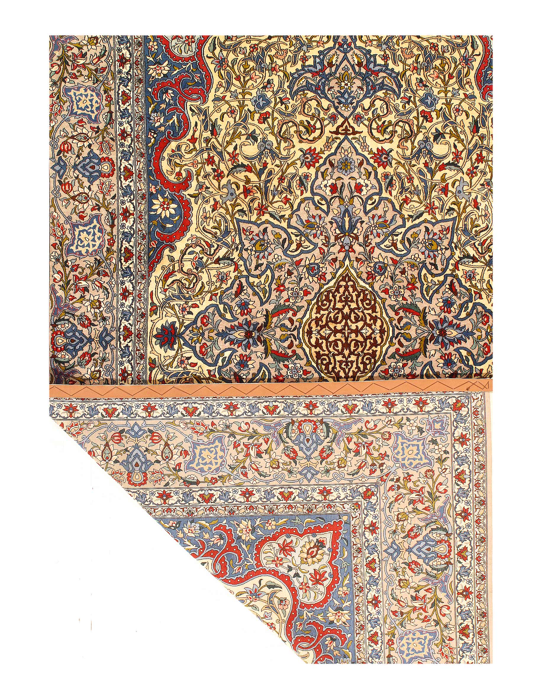 The Isfahan rugs are made with exceptionally good quality of wool & silk. They use traditional motifs inspired by architectural tiles that once decorated the historical buildings from which these rugs originated in. When it comes to high class designs the composition, patterns, and materials of Isfahan meets those expectations. The motifs usually consist of medallions with palmetts and also figural motifs. Isfahan rugs have an extremely high knot density and are woven with silk and golden threads, which give them their luxurious look.signed By serafian