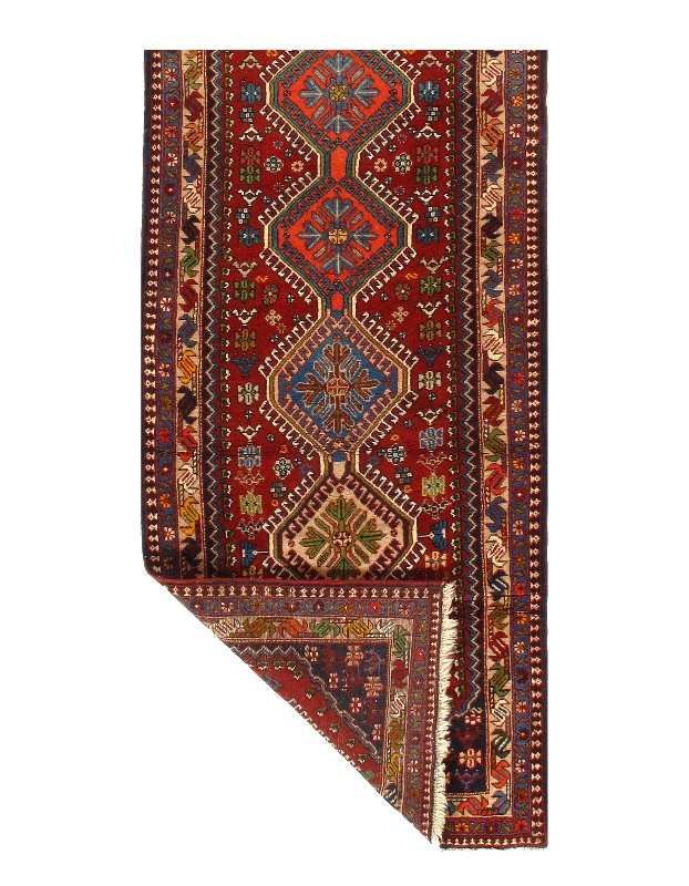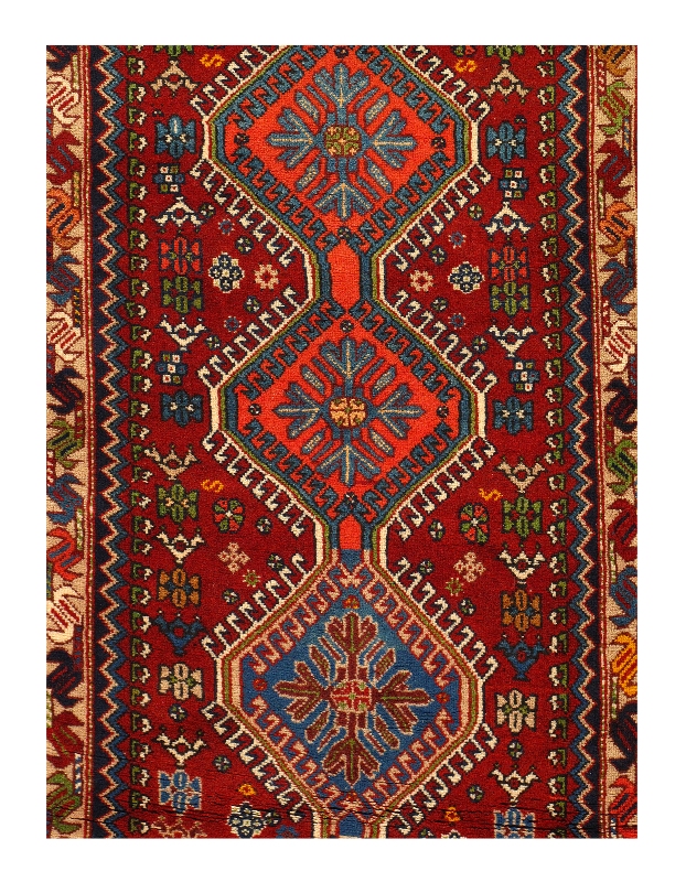 The pile used in Yalameh rugs is very fine, particularly in comparison to other tribal designs, using soft wool based on a Wool foundation. The pattern is distinctive with large repeated diamonds in a straight line down the carpet, often with geometrical animal or human prints scattered across the field. Dark red or light brown on a blue or orange background is most common for Yalameh, similar to Shiraz rugs, the rugs compliment modern or minimalist furniture beautifully, giving the living space an aura of luxurious style and warm.